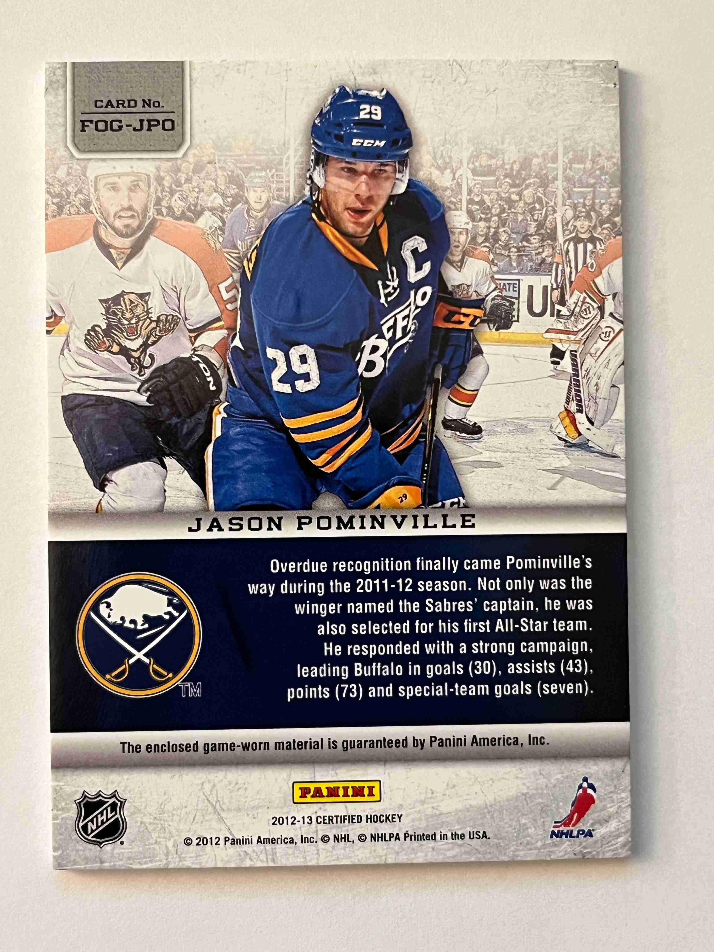 Jason Pominville 2012-13 Panini Certified Fabric of the Gam