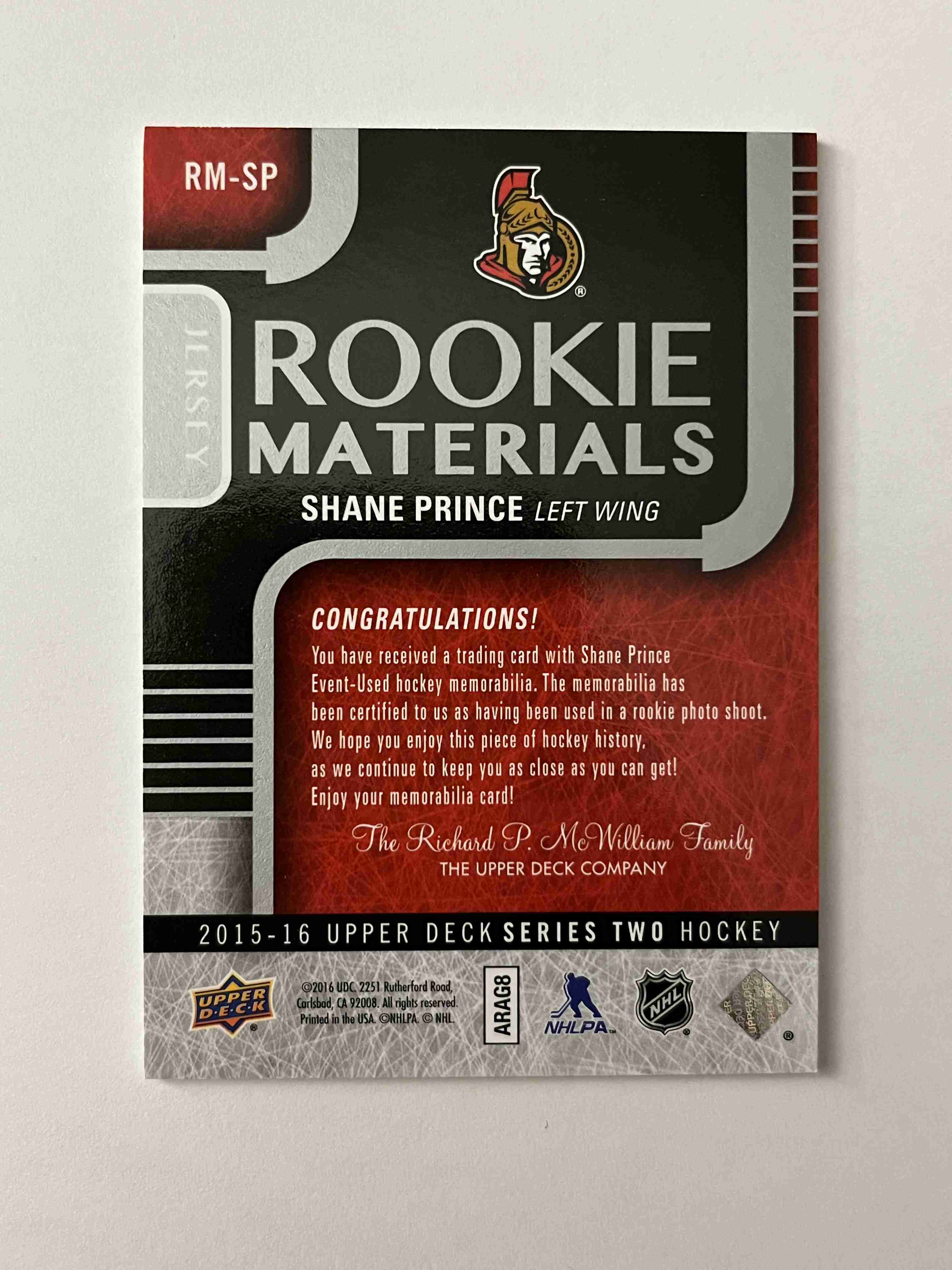 Shane Prince 2015-16 Upper Deck Rookie Materials Jersey