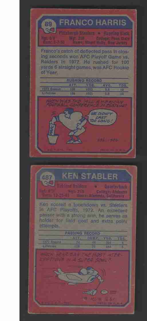 1973 Topps Football Lot (2) - Franco (RC) & Stabler (RC). Classic Rookie Cards of two All-Time greats from the 1970's. Also, two of the higher-valued cards from the 1973 Topps Football set. These cards are in the lower-grade range - surface crease, wrinkle, corner wear. Ships no tracking. Please review scans carefully for condition.
