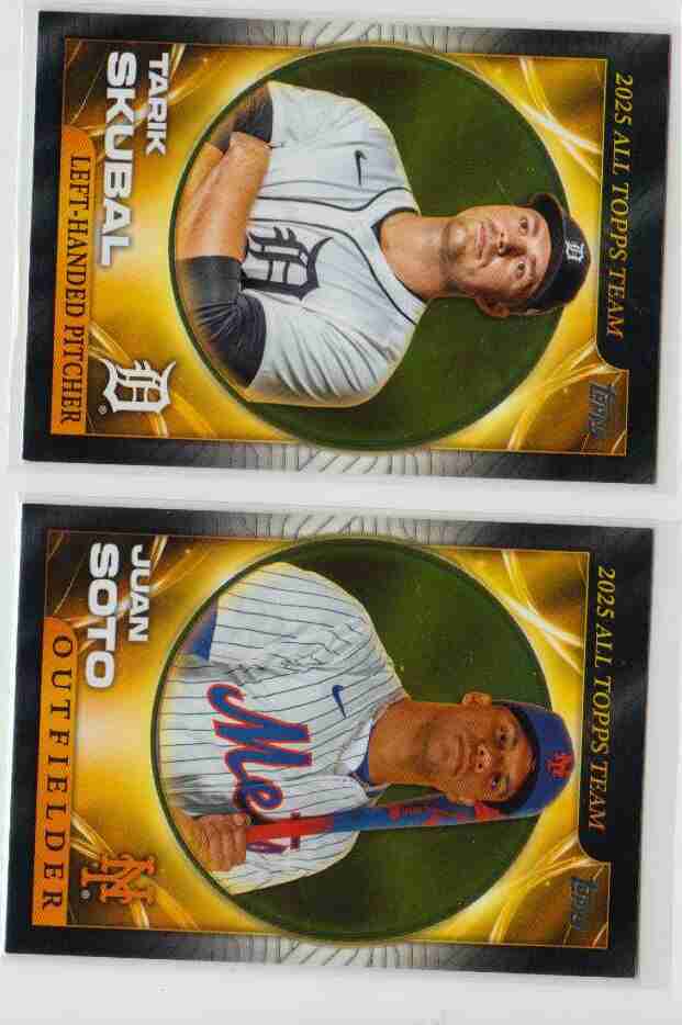 Please look at the photos for details on the cards' condition. The cards you are bidding on are the cards pictured. This auction is for 2 2026 Topps Series 1 2025 All Topps Team inserts. They are Juan Soto and Tarik Skubal. You can use your judgment on the grade of the cards. If you have any questions or require more detailed photos, please don't hesitate to ask. Note: The shipping price shown is for PWE. The card will ship with a tracking number if the final auction price exceeds a certain dollar amount (or if it is combined with the appropriate number of other completed auctions). Otherwise, the card will be shipped PWE. Thank you!