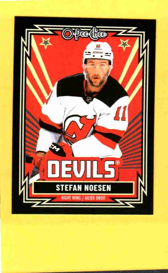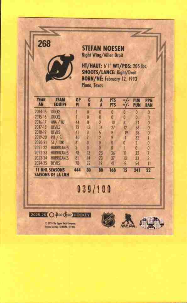 2025–26 O‑Pee‑Chee Retro Black Border parallel of Stefan Noesen #268, serial numbered 039/100, featuring the New Jersey Devils.