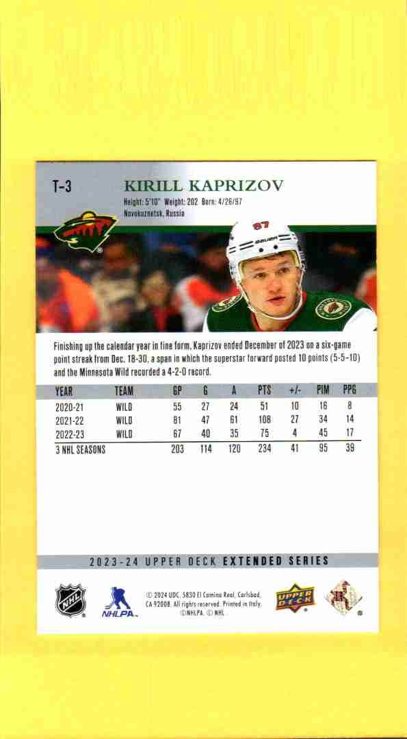 2023–24 Upper Deck Extended Series Retro #T-3 Kirill Kaprizov featuring the Minnesota Wild superstar forward. This insert card highlights Kaprizov, one of the NHL’s most dynamic scorers and a former Calder Trophy winner. Classic Upper Deck retro-style design with a sharp in-game action image.