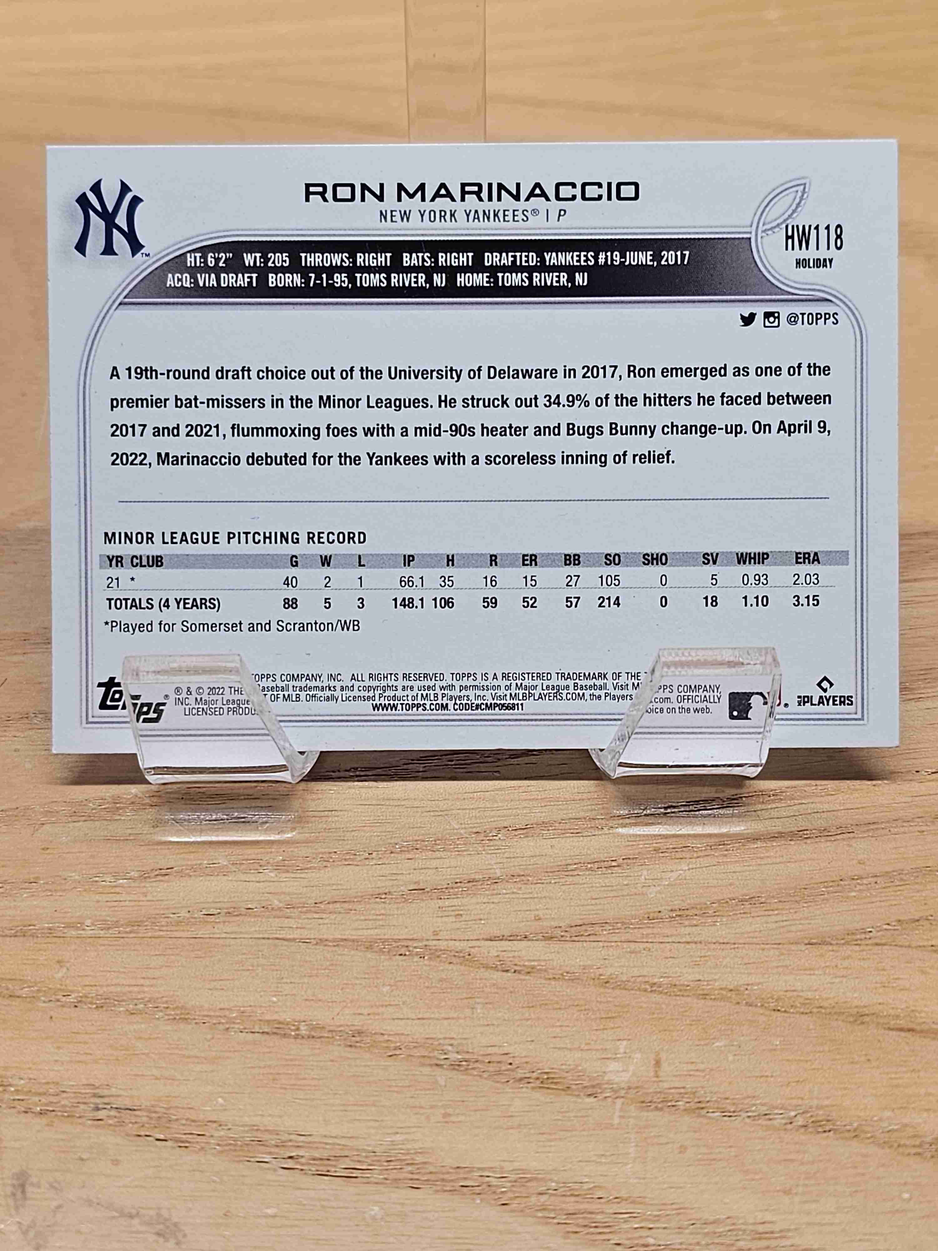 2022 Topps Holiday Baseball Rookie RC Ron Marinaccio New York Yankees Card #HW118