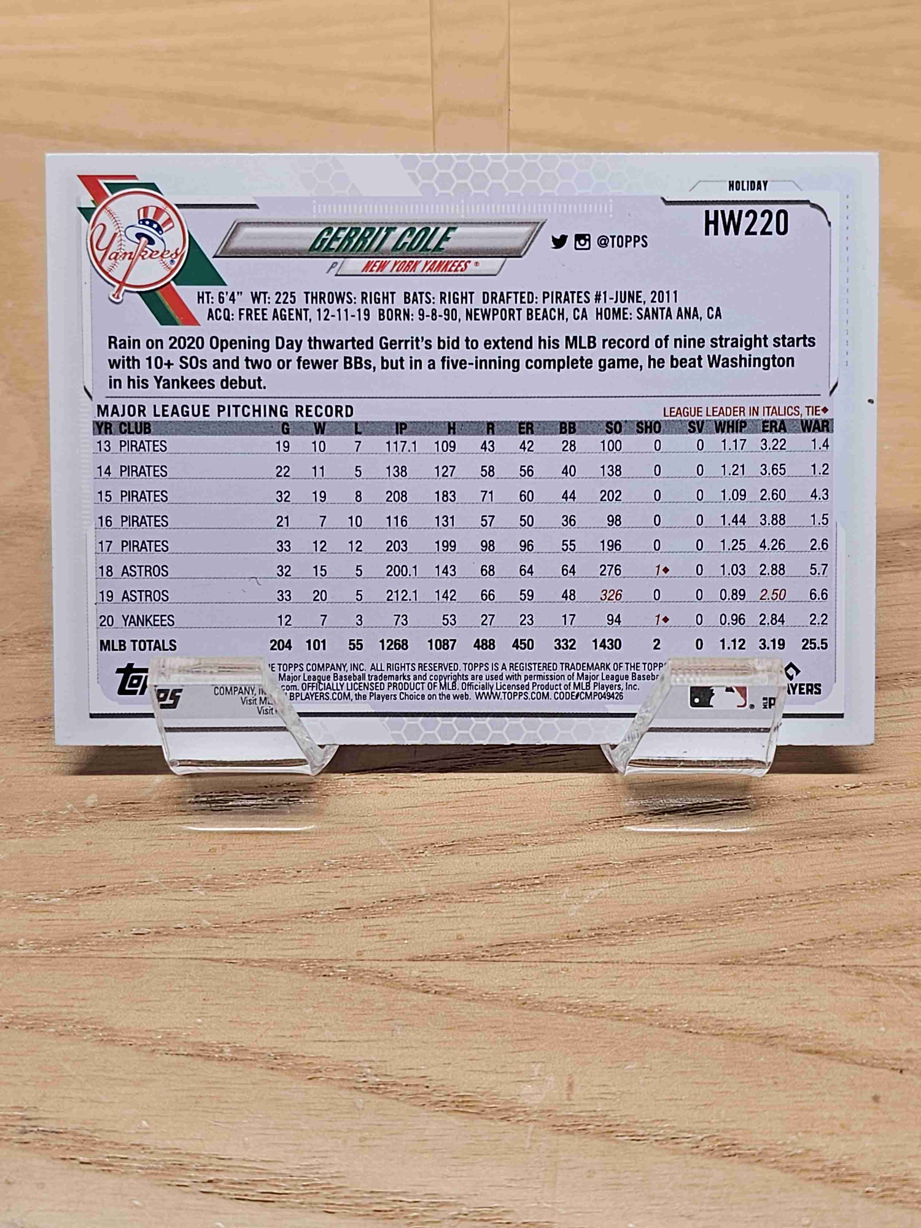 2021 Topps Holiday Baseball Gerrit Cole Wearing Santa Hat New York Yankees Card #HW220