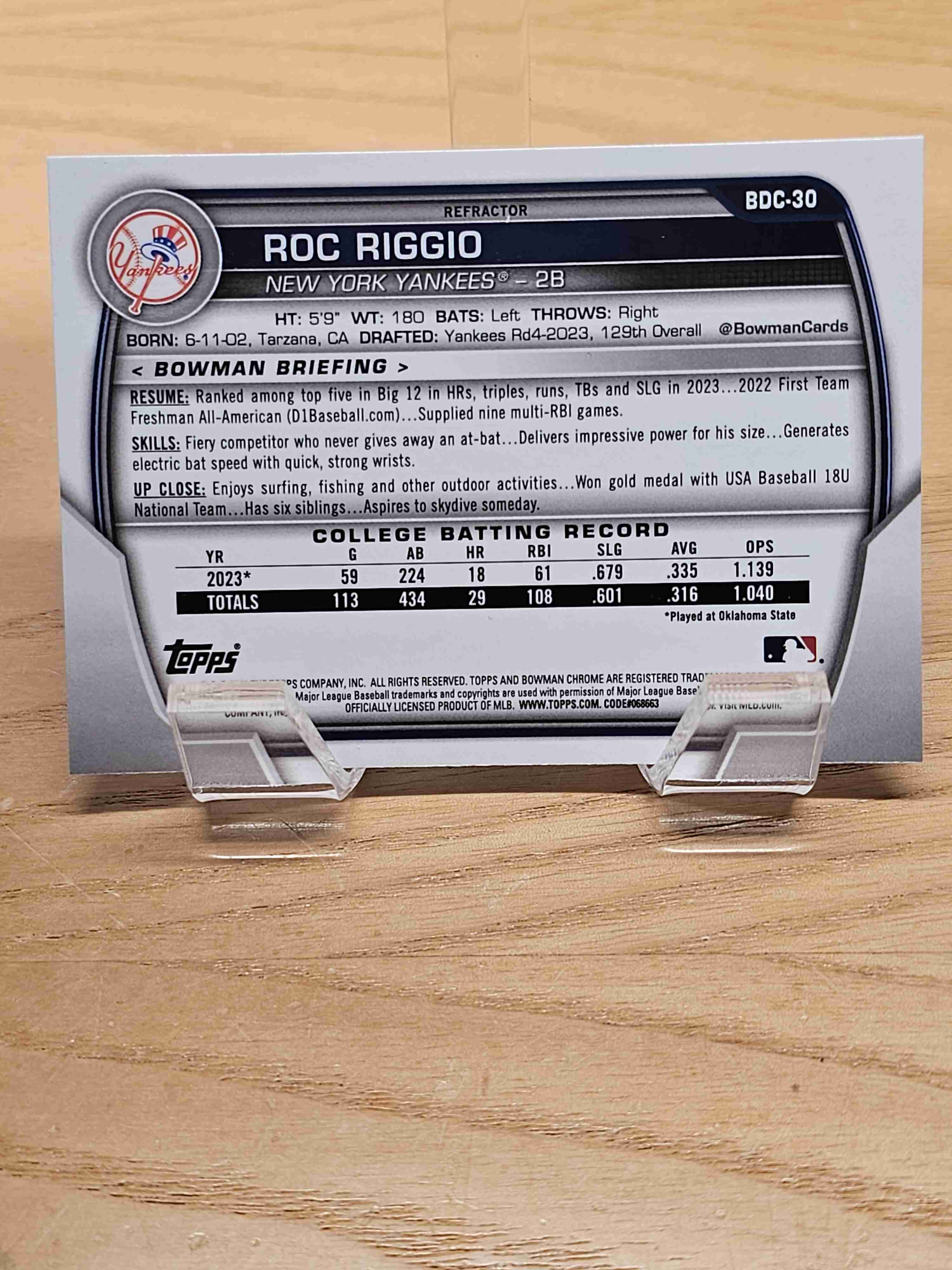 2023 Bowman Chrome Baseball 1st Bowman Draft Chrome Refractor Roc Riggio New York Yankees Card #BDC-30