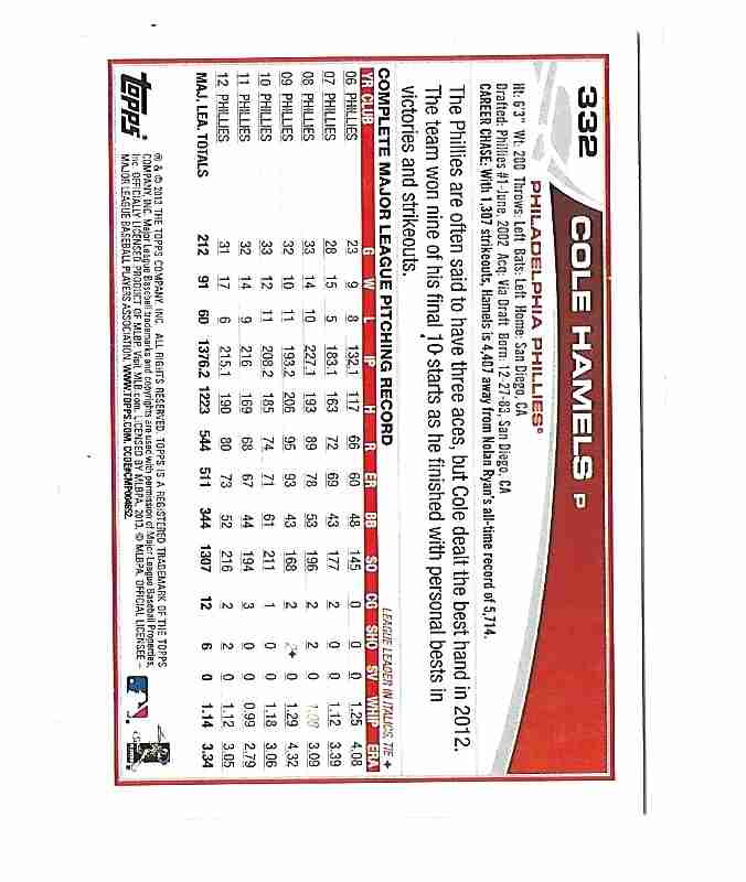 2013 TOPPS EMERALD GREEN COLE HAMELS #332 NM