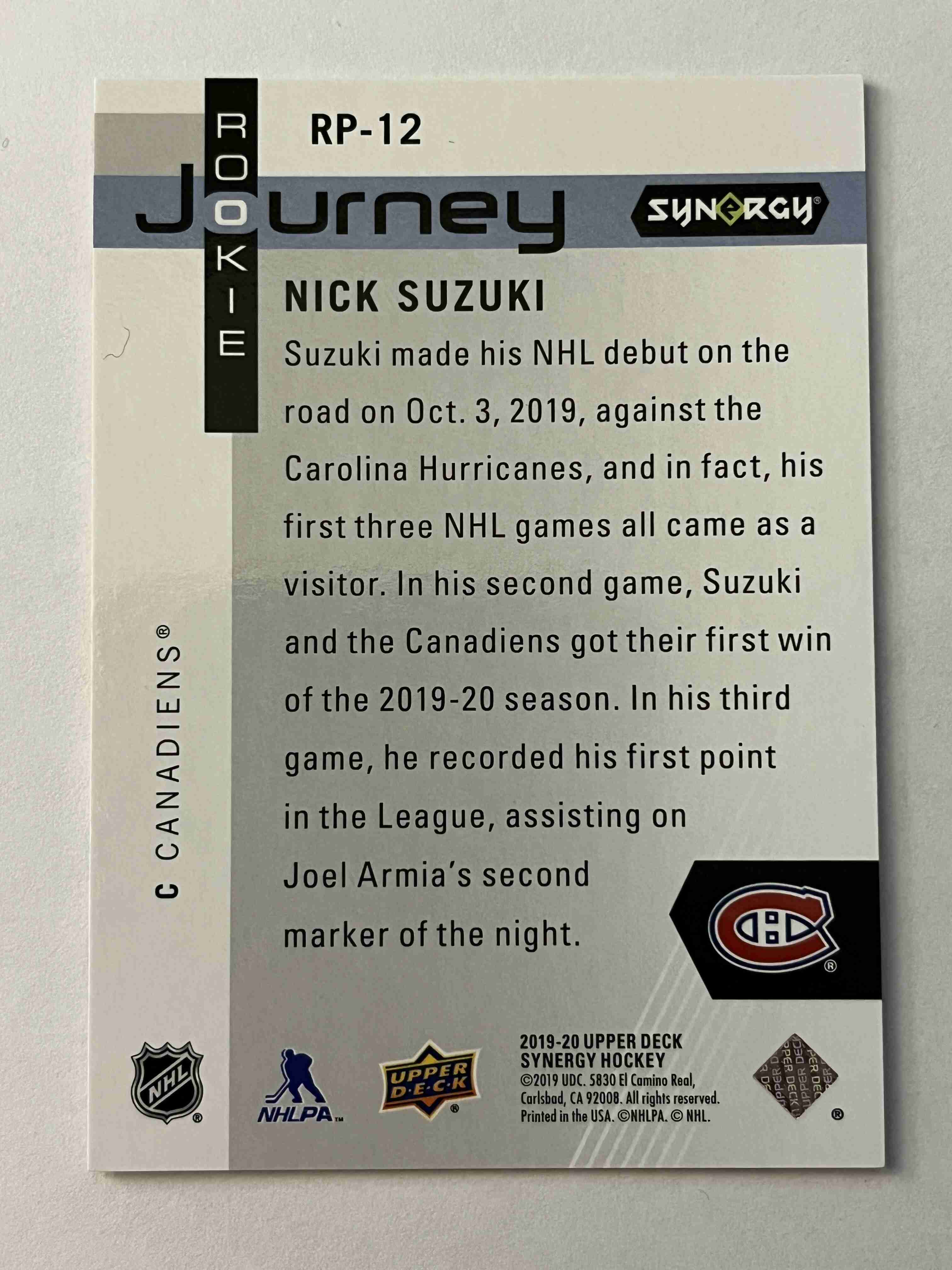 Nick Suzuki 2019-20 UD Synergy Rookie Journey RC (#/999)