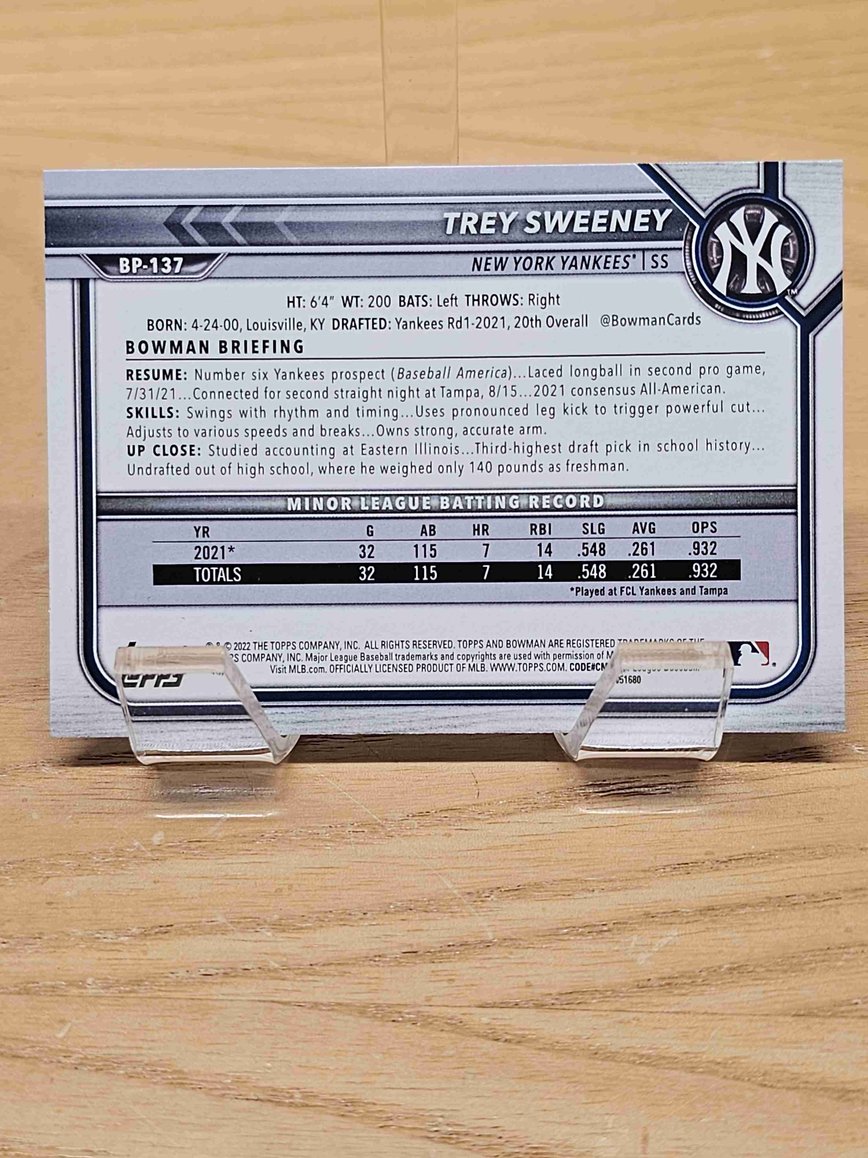 2022 Bowman Trey Sweeney 1st Bowman Prospects Yankees