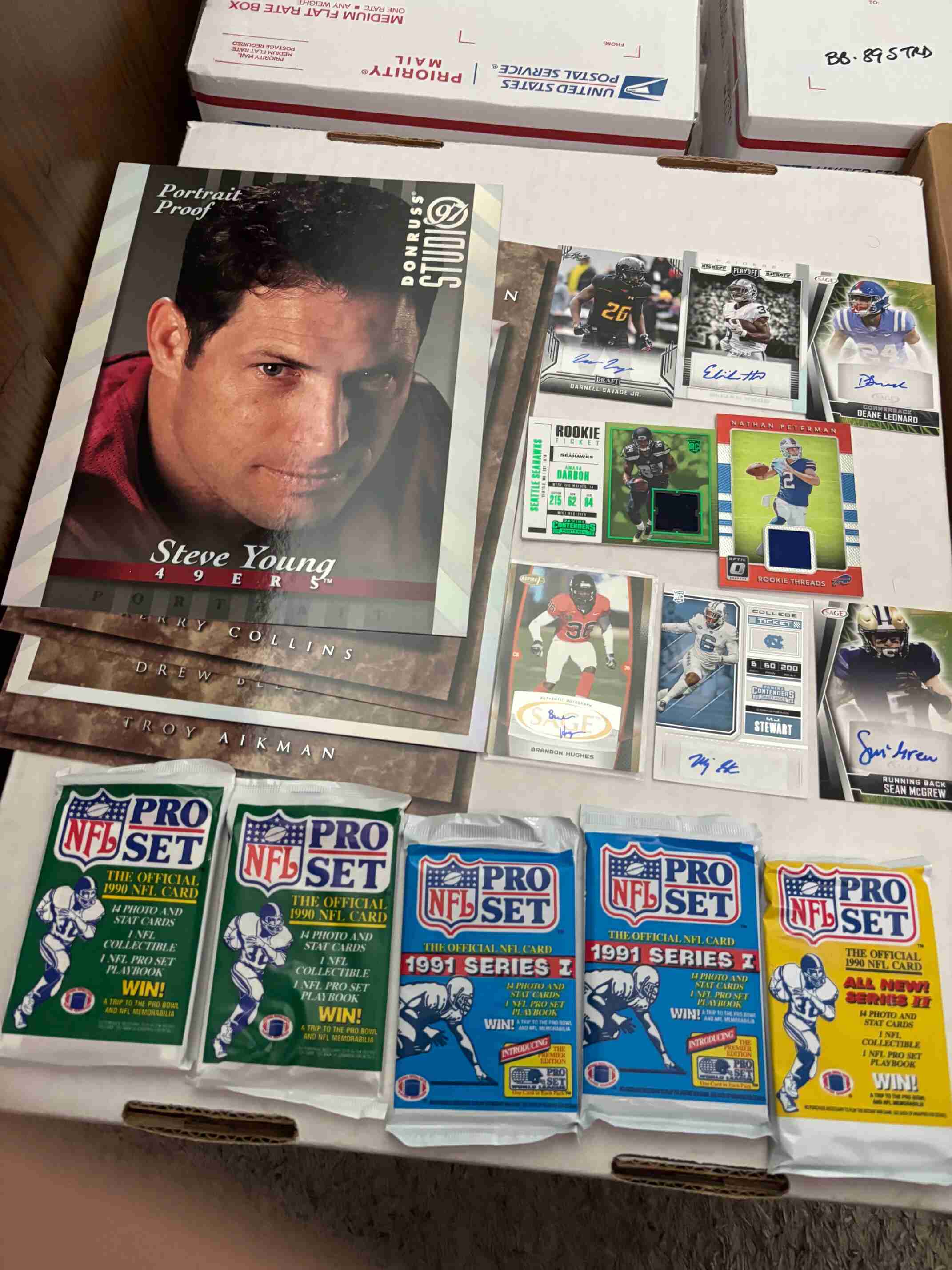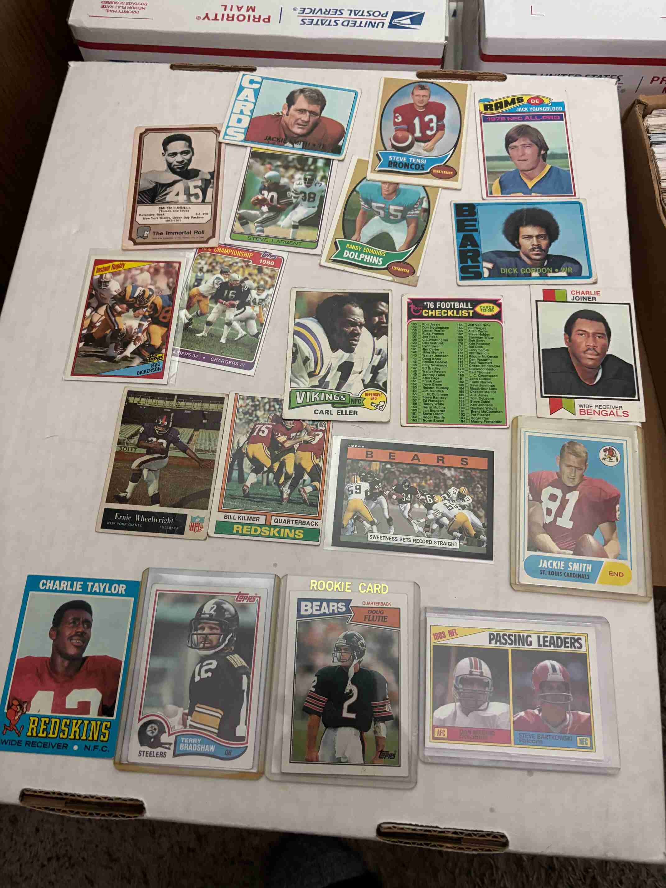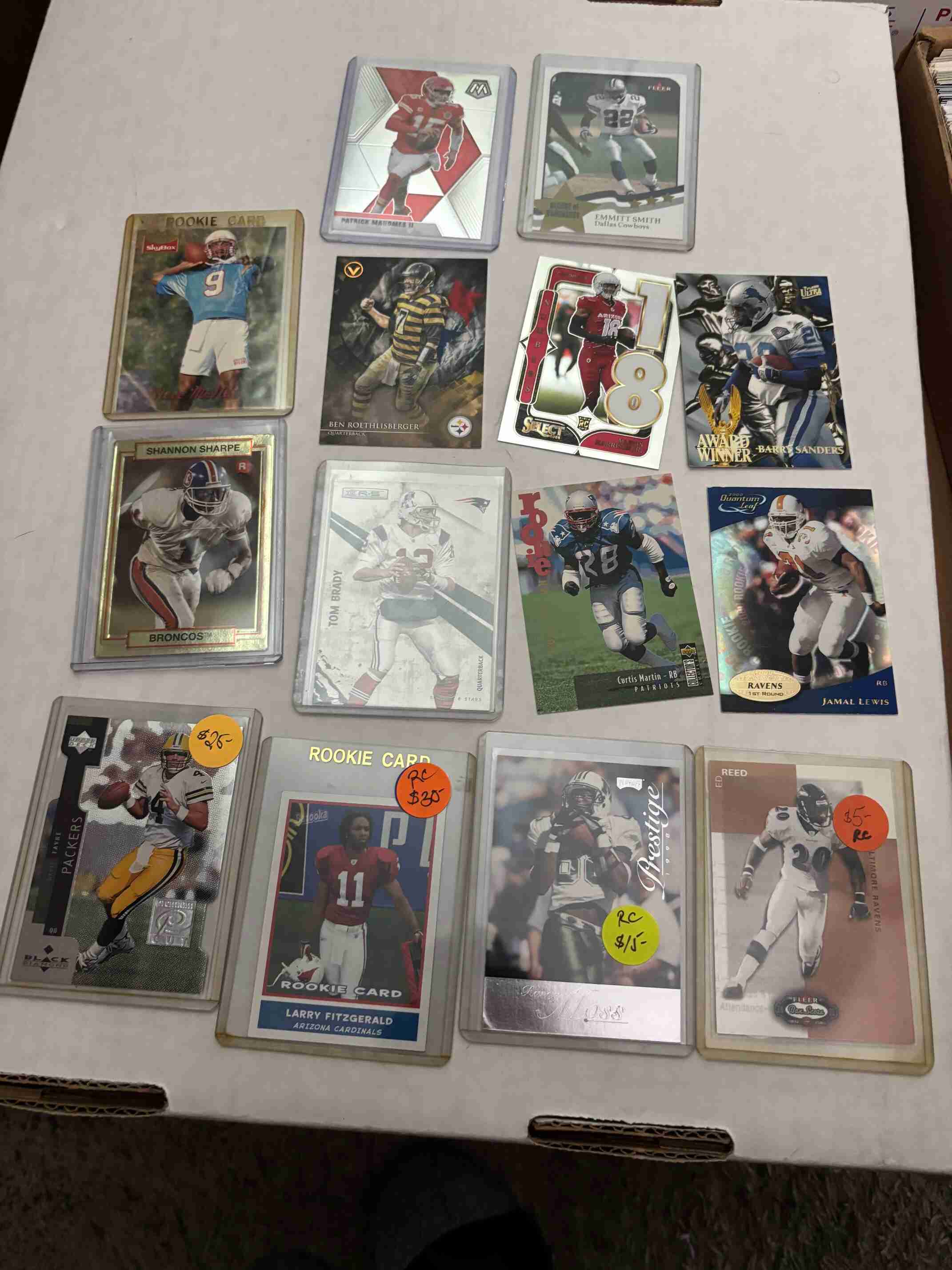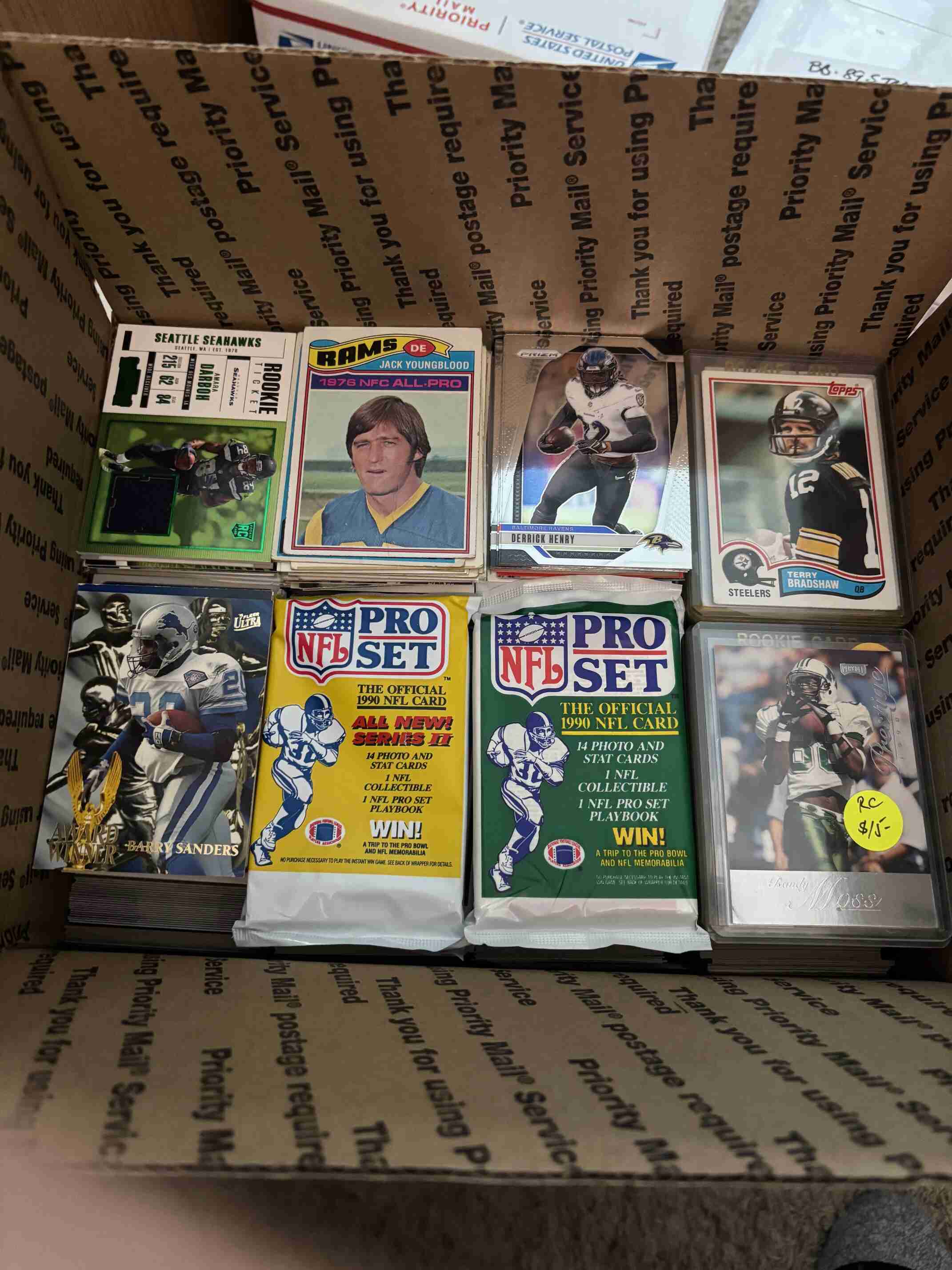 Huge clearance collection of 2500 Football cards loaded with high value vintage, rookies, stars, rare portraits, autographs, game used, and unopened packs, all in great condition. You will receive everything shown in the photos and more. I am having a complete clearance of my 2,000,000 card collection, so please check out my other auctions for more great deals.