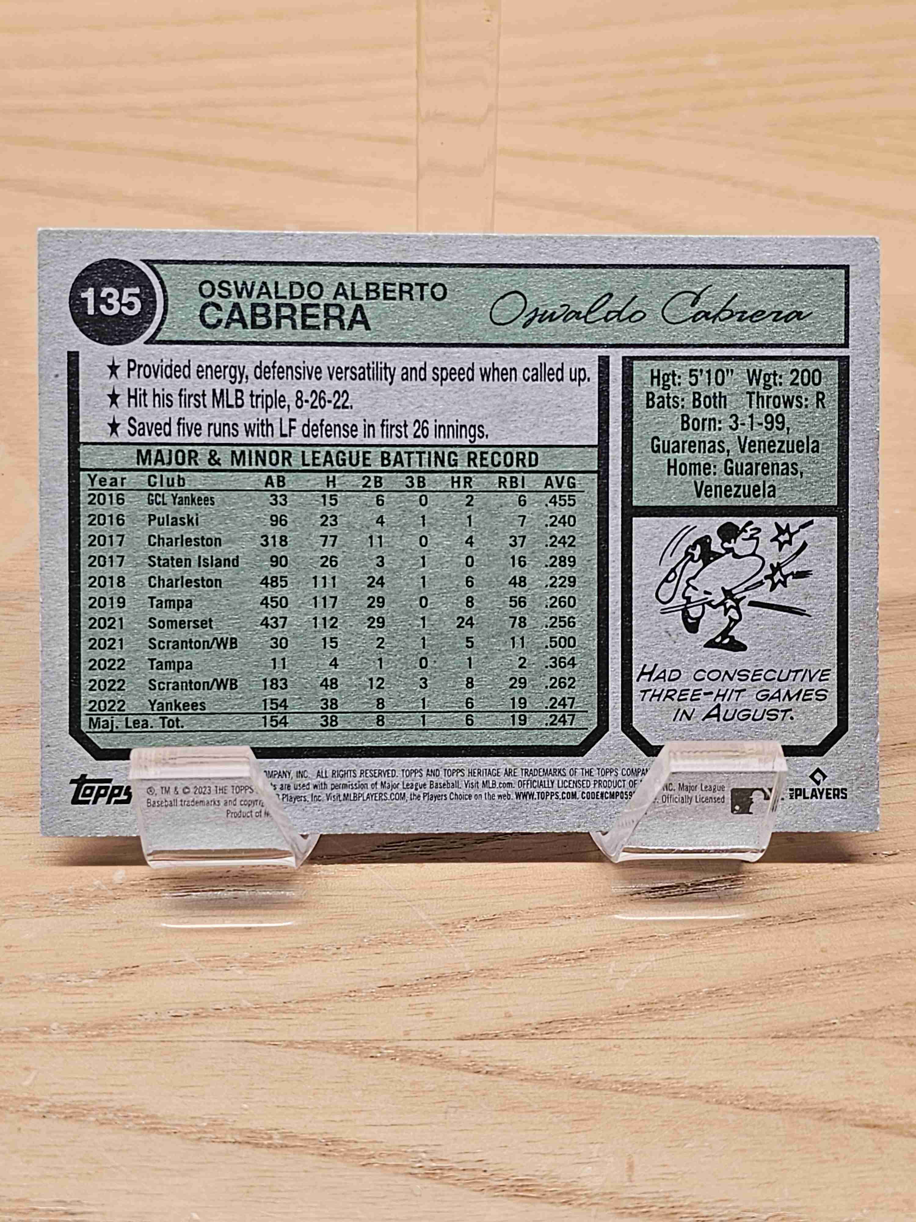 2023 Topps Heritage Baseball Rookie RC Oswald Cabrera New York Yankees Card #135
