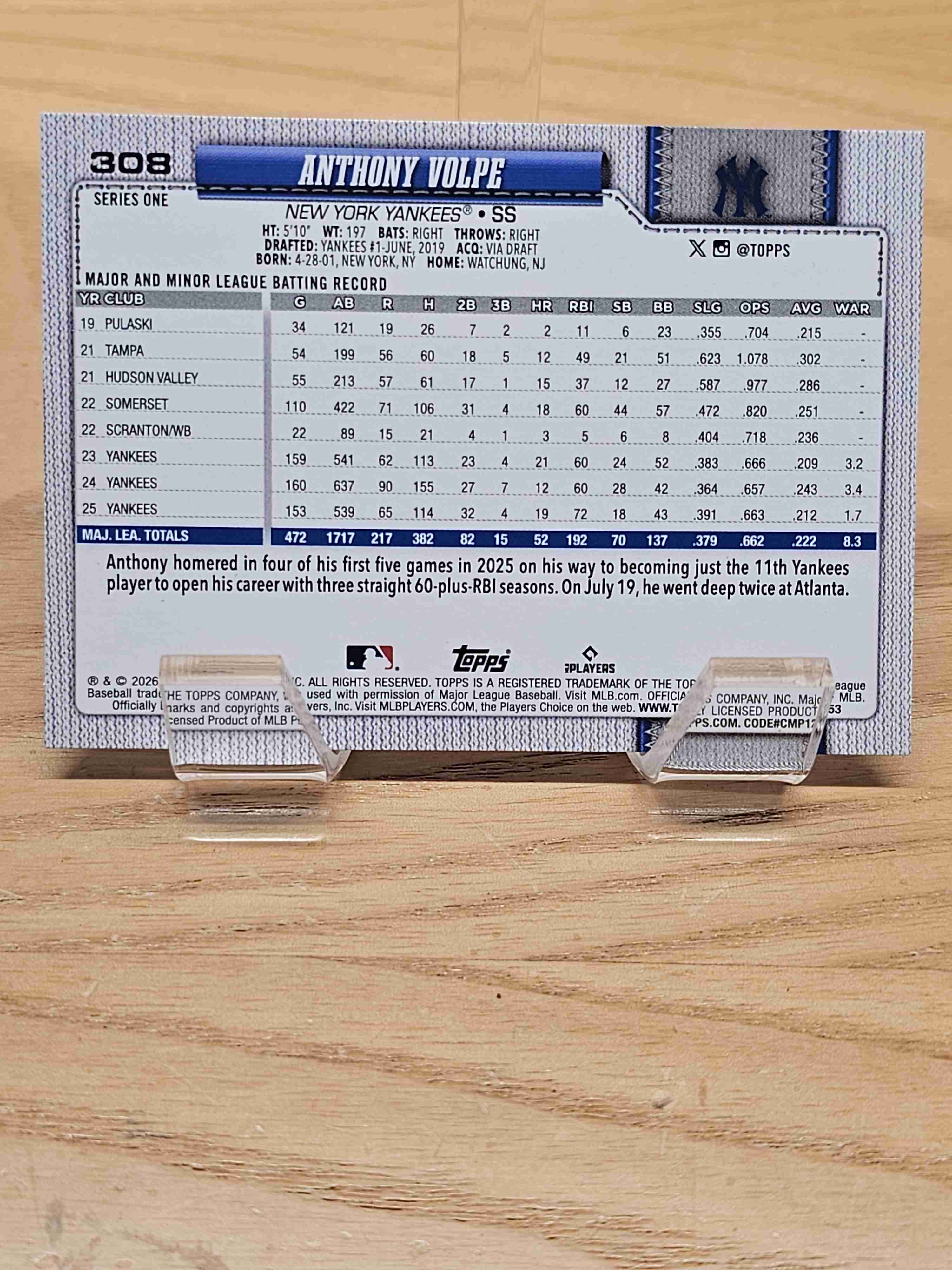 2026 Topps Series One Baseball Anthony Volpe New York Yankees Card #308