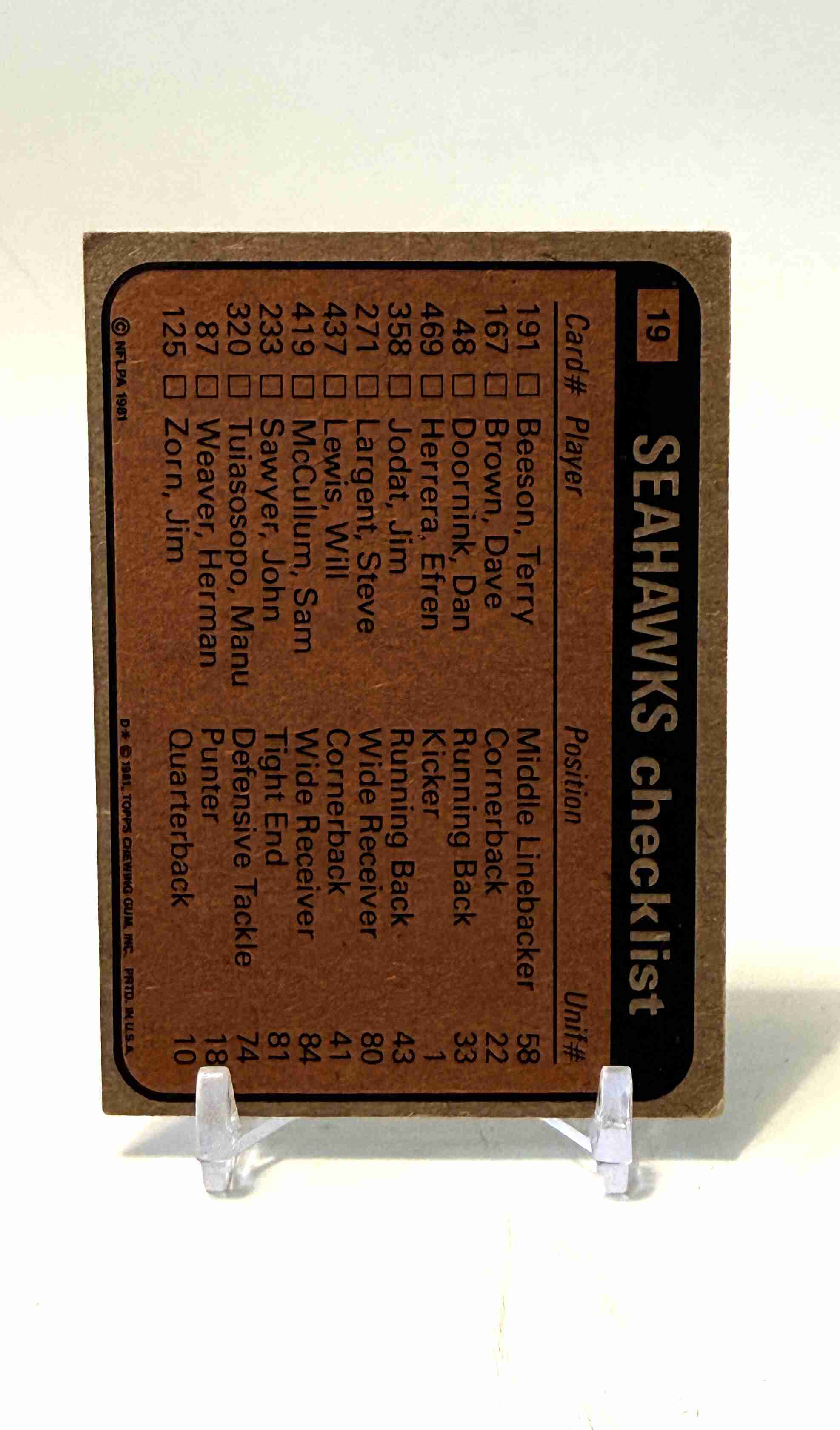 1981 Topps SEAHAWKS TEAM LEADERS CHECKLIST card # 19 (STEVE LARGENT