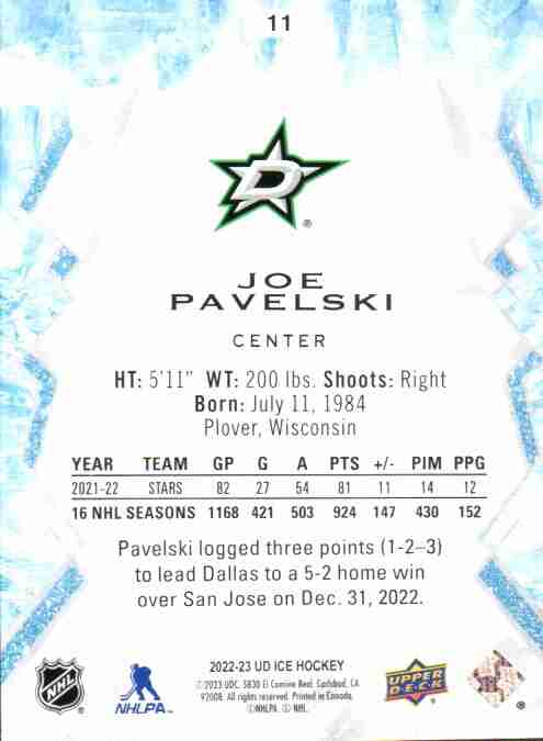 Joe Pavelski [Purple] #11 2022 Upper Deck Ice Hockey Estimated Grade (Raw Card) Near Mint to Mint (NM–MT) — Approx. PSA 9