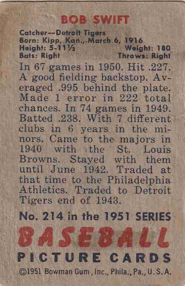 1951 Bowman # 214 Bob Swift Tigers