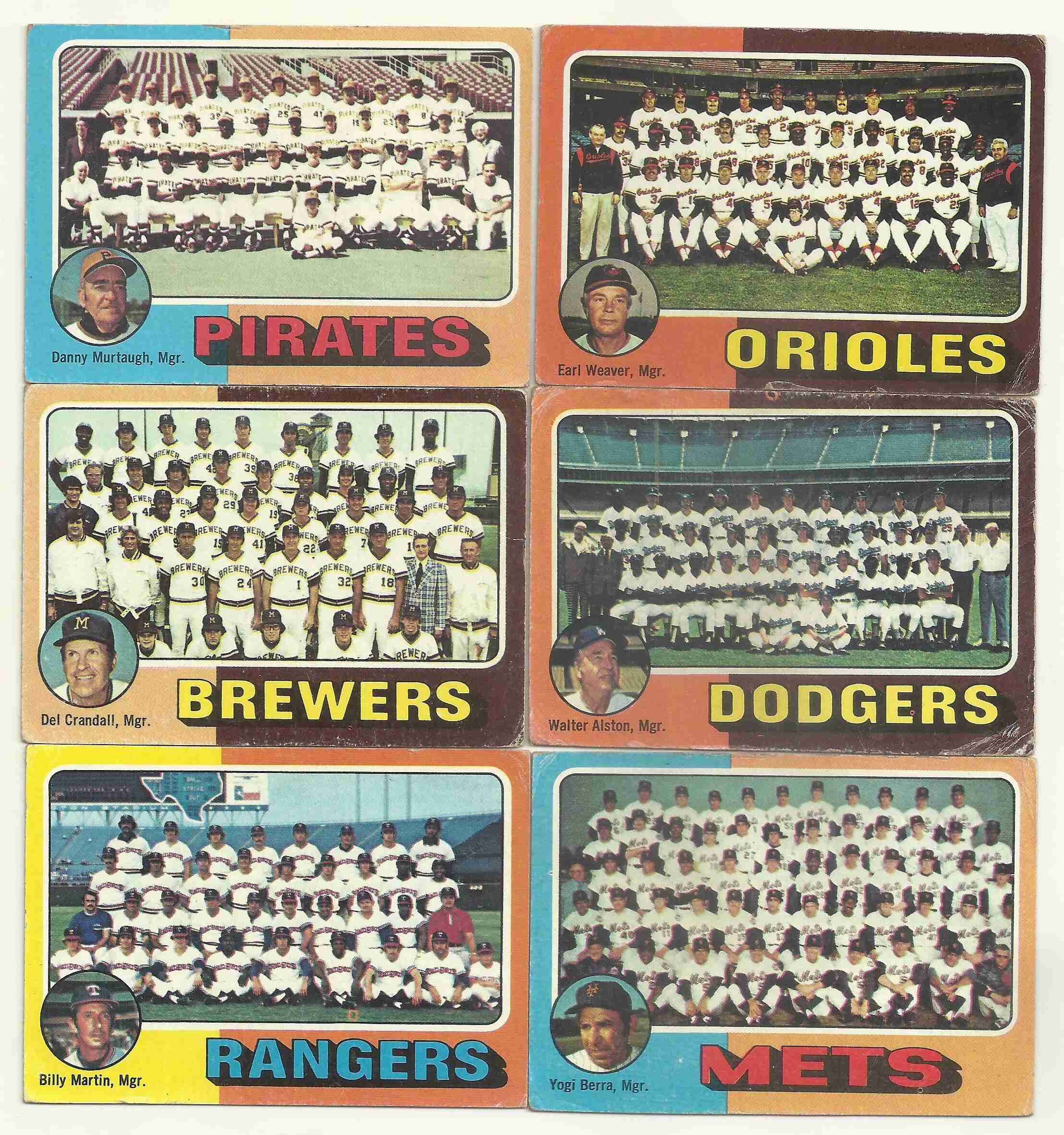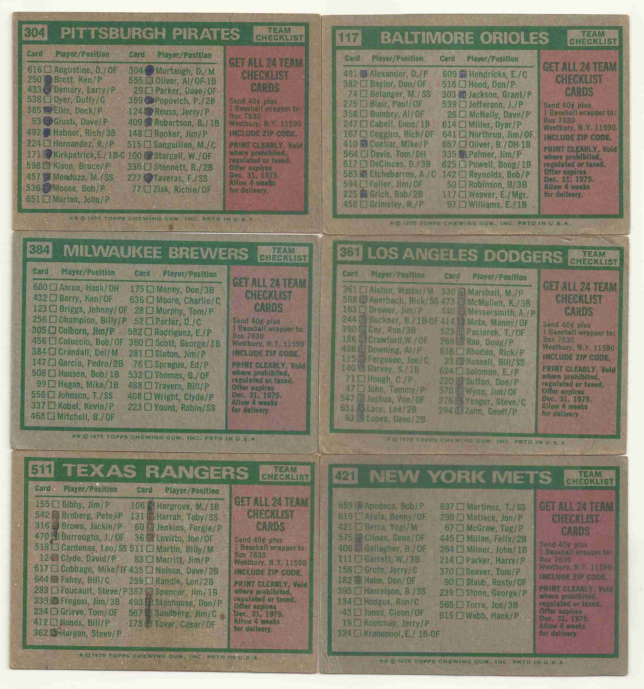 1975 Topps Team Checklist Cards Lot of 6. Five cards have marks on the back.