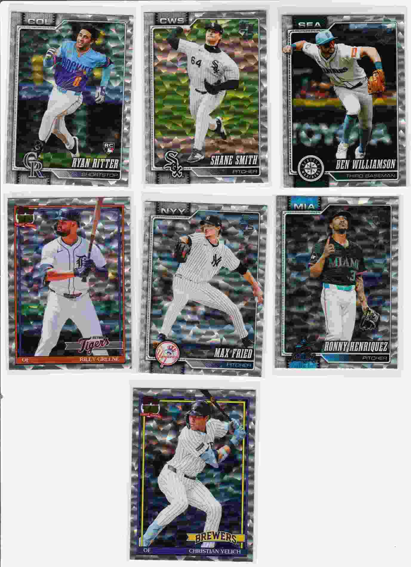 Please take a look at the photos for details on the cards' condition. The cards you are bidding on are the cards pictured. This auction is for 7 2026 Topps Series 1 Silver Crackle Foil parallels. Please take a look at the image for a complete listing. You can use your judgment on the grade of the cards. If you have any questions or require more detailed photos, please don't hesitate to ask. Note: The shipping price shown is for PWE. The card will ship with a tracking number if the final auction price exceeds a certain dollar amount (or if it is combined with the appropriate number of other completed auctions). Otherwise, the card will be shipped PWE. Thank you!