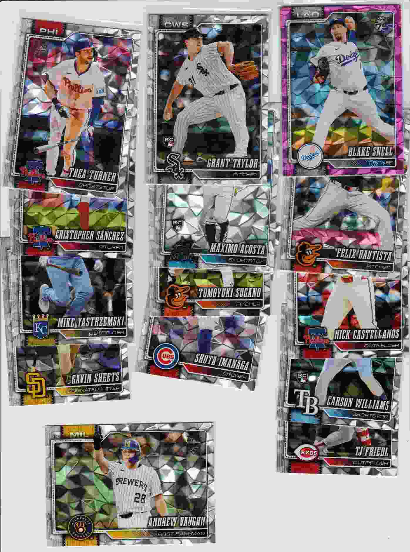 Please look at the photos for details on the cards' condition. The cards you are bidding on are the cards pictured. This auction is for 14 2026 Topps Series 1 Diamonte Foil parallels. Please take a look at the photo for a complete listing. You can use your judgment on the grade of the cards. If you have any questions or require more detailed photos, please don't hesitate to ask. Thank you!