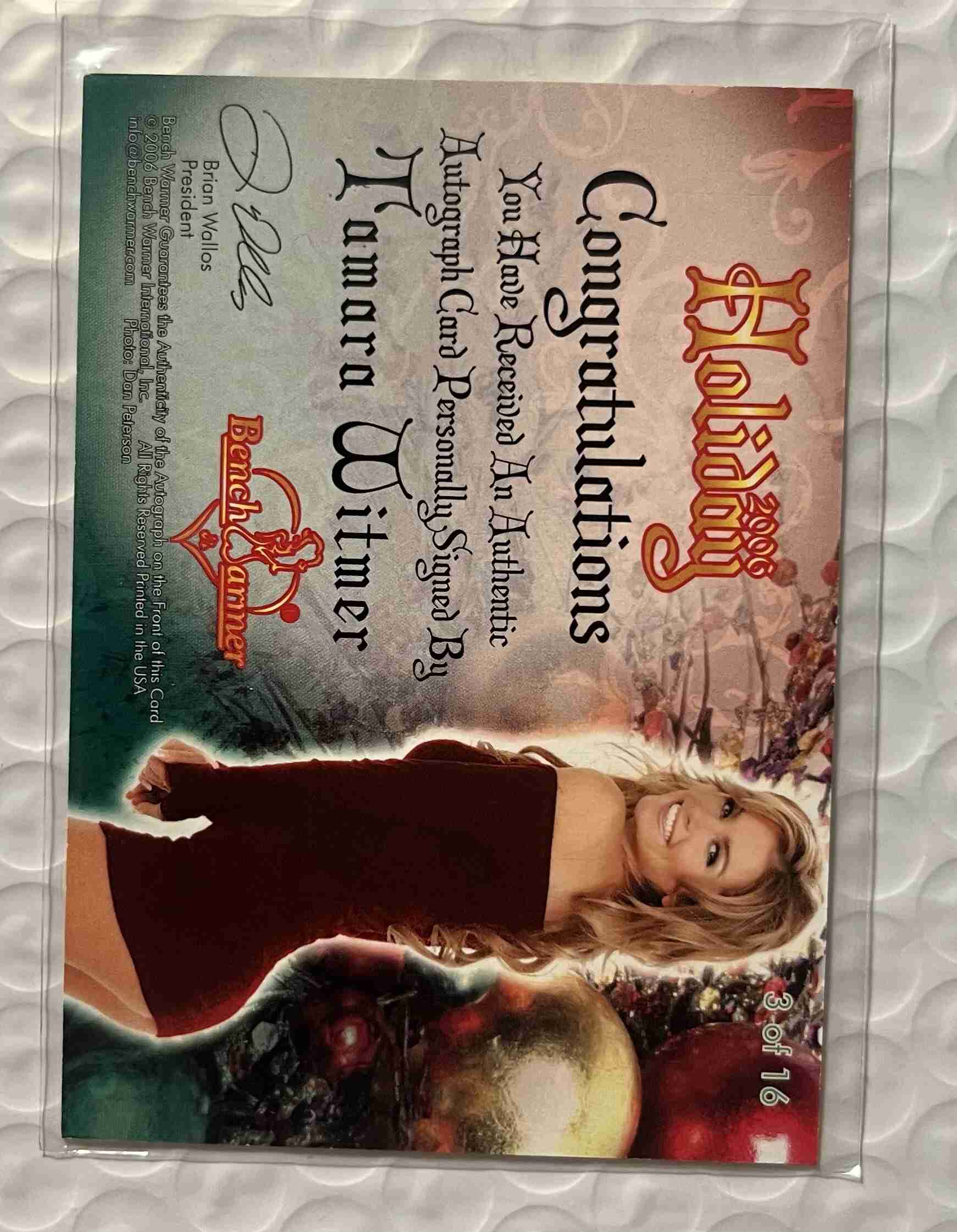 This auction is of a 2006 Bench Warmer Tamara Witmer Autograph card. Card is Nrmt condition. Look at the pics and judge for yourself. If any questions please feel free to contact me. Thank you for looking at my auctions.