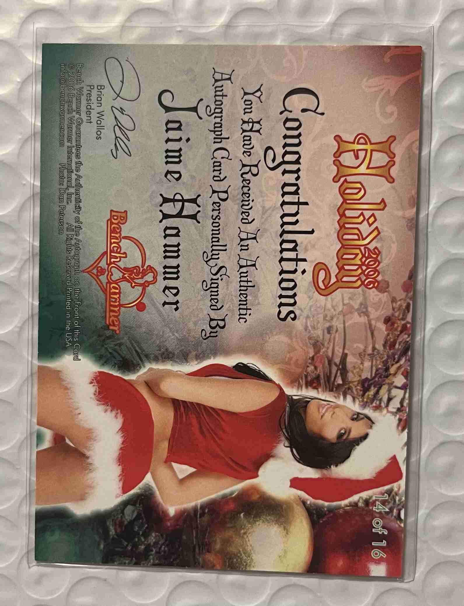 This auction is of a 2006 Bench Warmer Jaime Hammer Autograph card. Card is Nrmt condition. Look at the pics and judge for yourself. If any questions please feel free to contact me. Thank you for looking at my auctions.