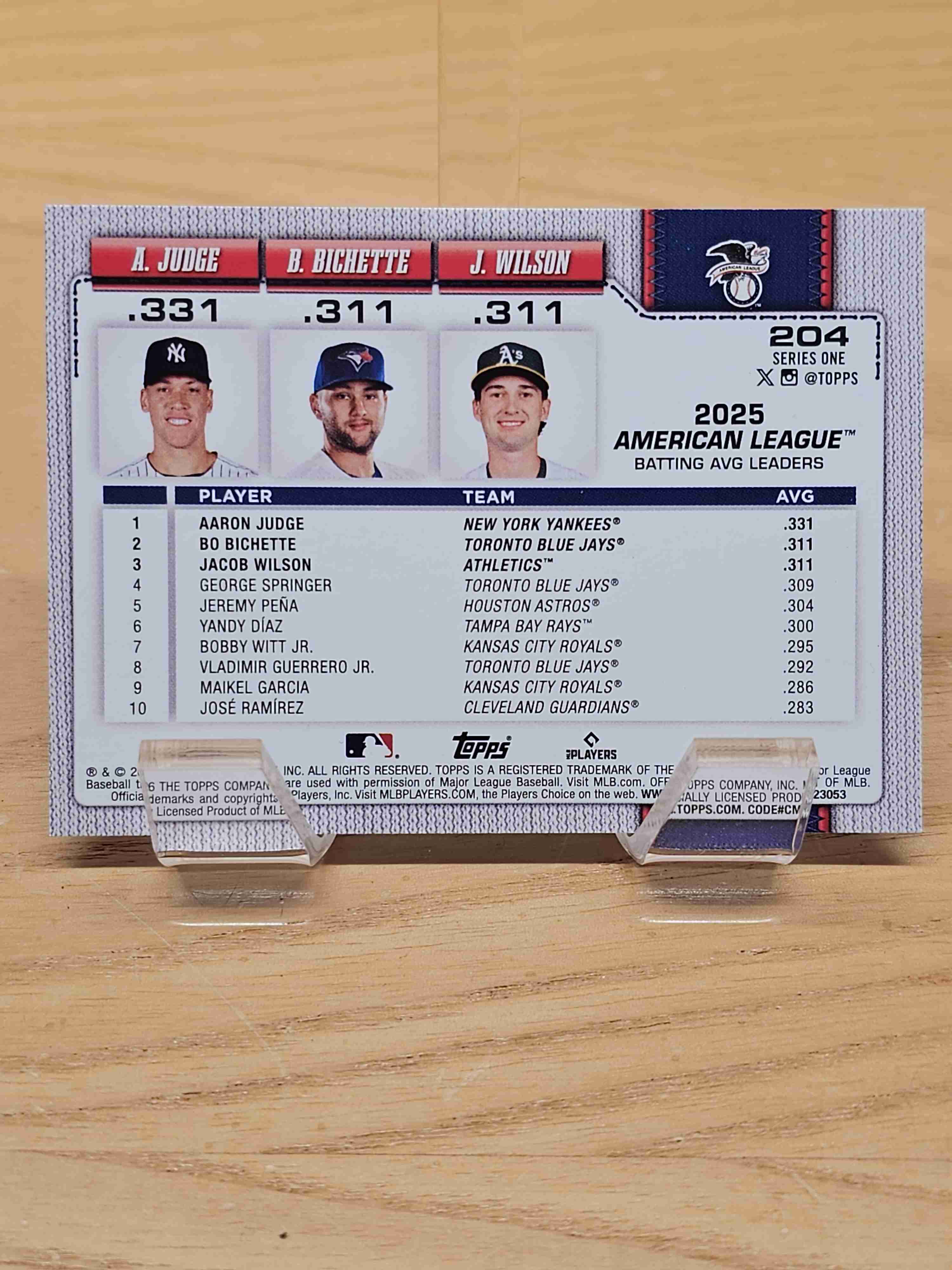 2026 Topps Baseball Batting AVG Leaders Aaron Judge Bo Bichette Jacob Wilson New York Yankees Toronto Blue Jays Oakland Athletics Card #204
