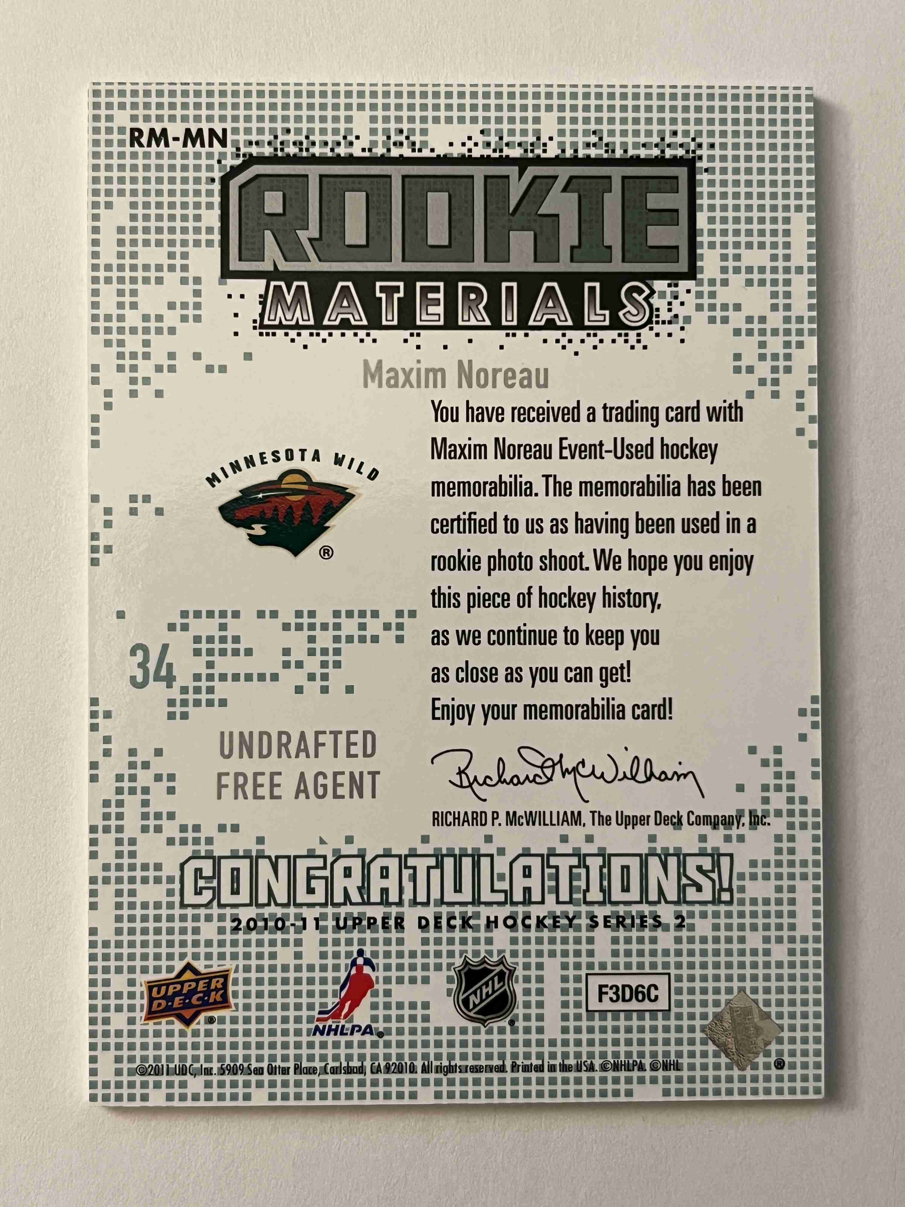 Maxim Noreau 2010-11 Upper Deck Rookie Materials Jersey