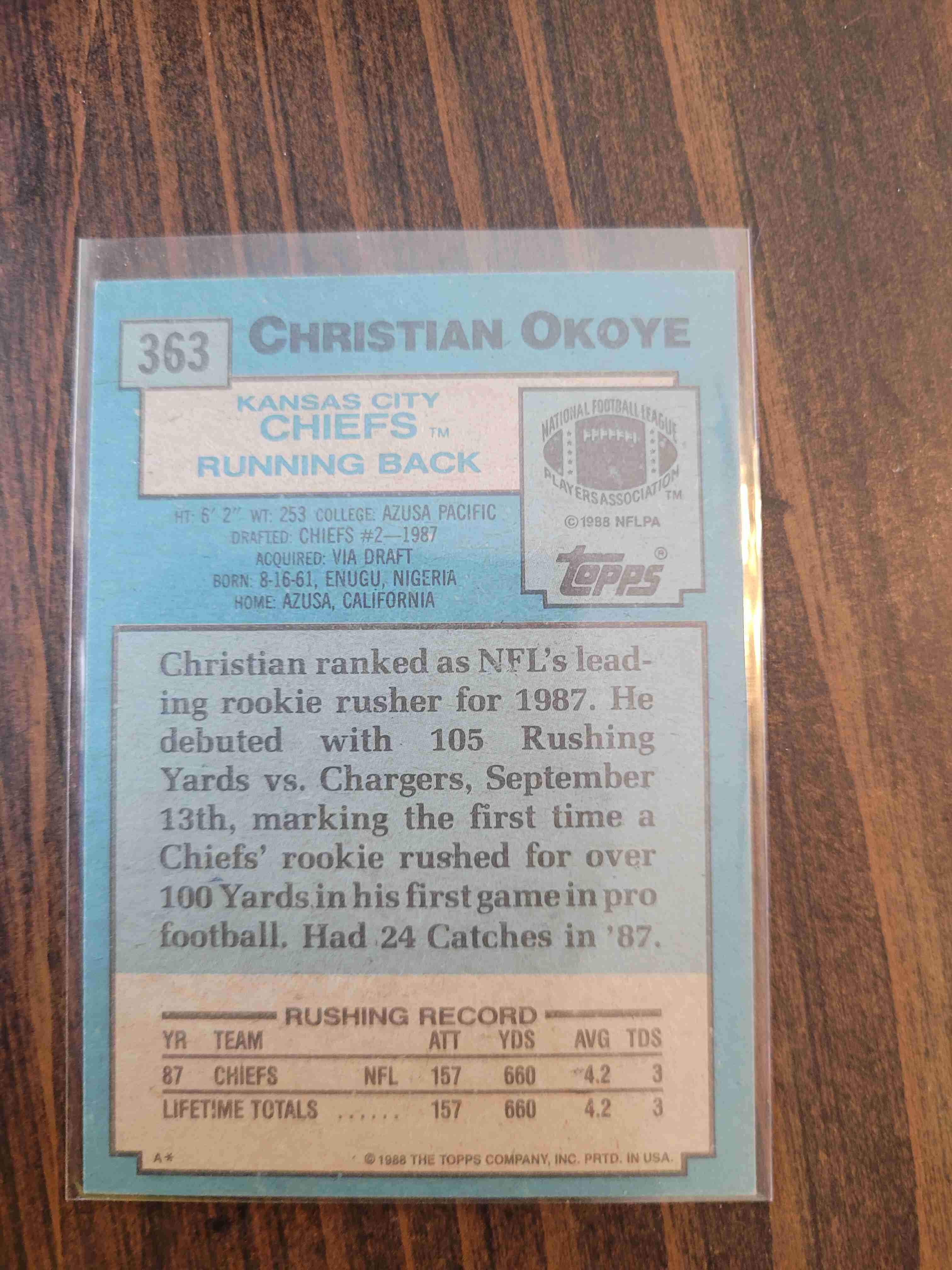 1988 TOPPS CHRISTIAN OKOYE #363 ROOKIE