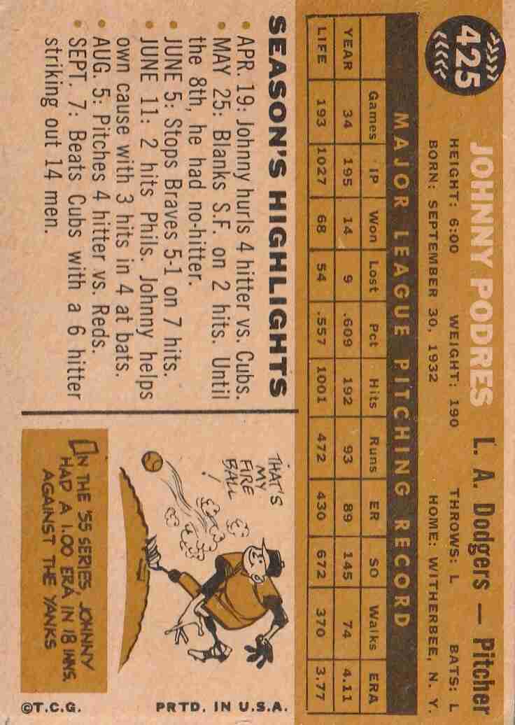 1960 Topps # 425 Johnny Podres LA Dodgers