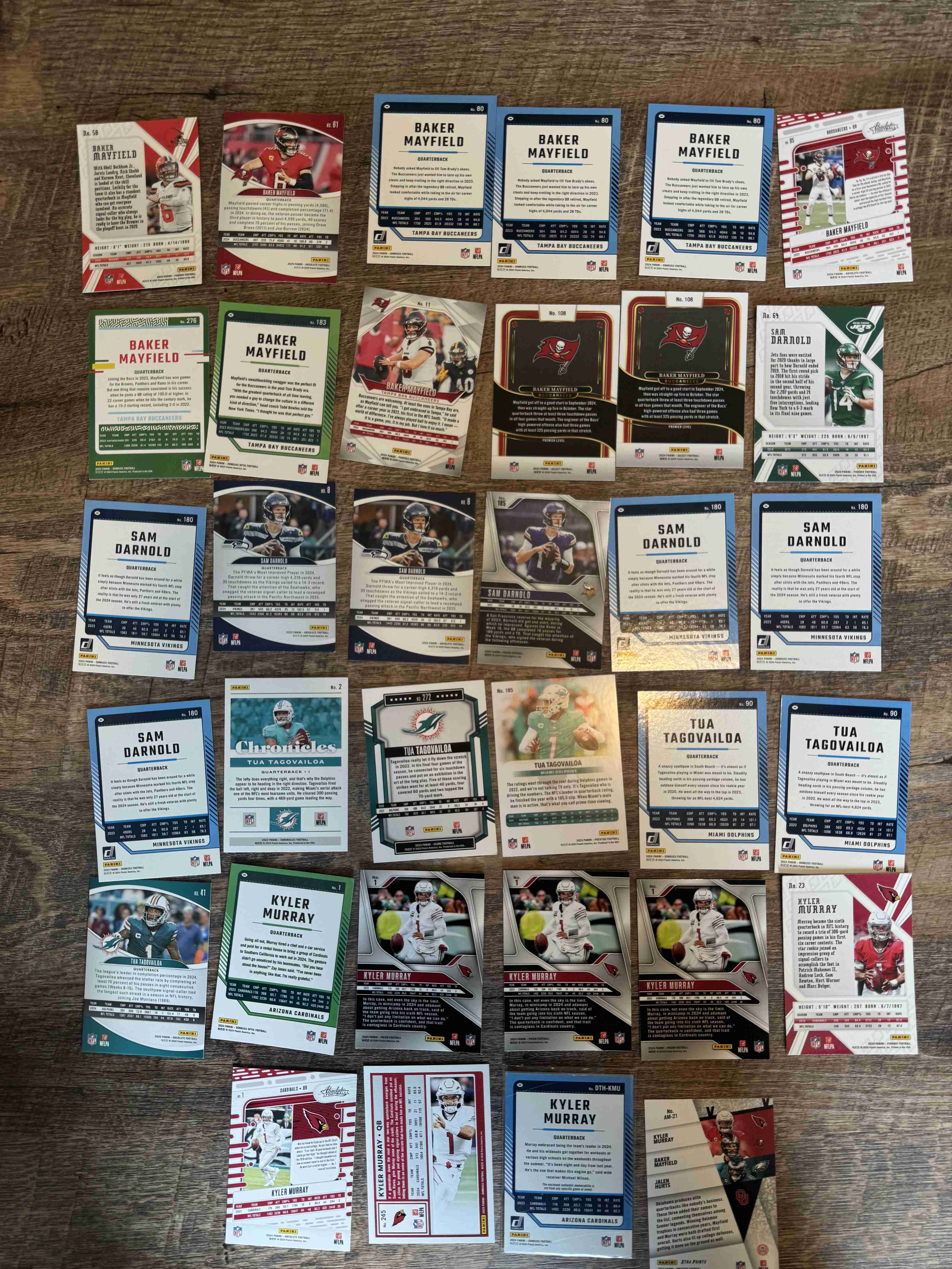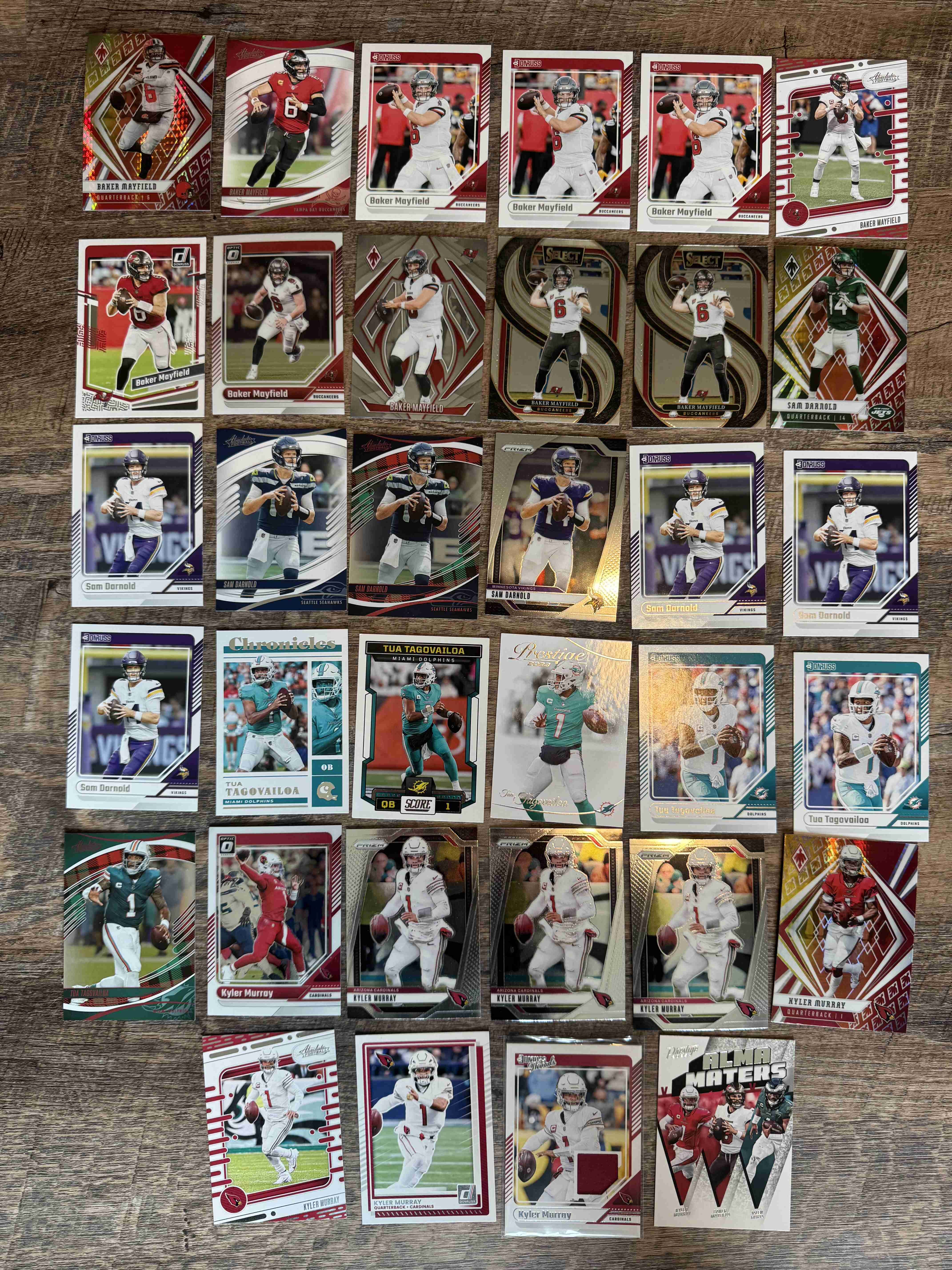 This auction is for the 35-card lot shown in the images and described in the title. Lot includes Pro Bowl QBs: Baker Mayfield, Sam Darnold, Kyler Murray, and Tua Tagovailoa. Includes base, parallels, inserts, and relics. Cards ship in team bag and bubble mailer.