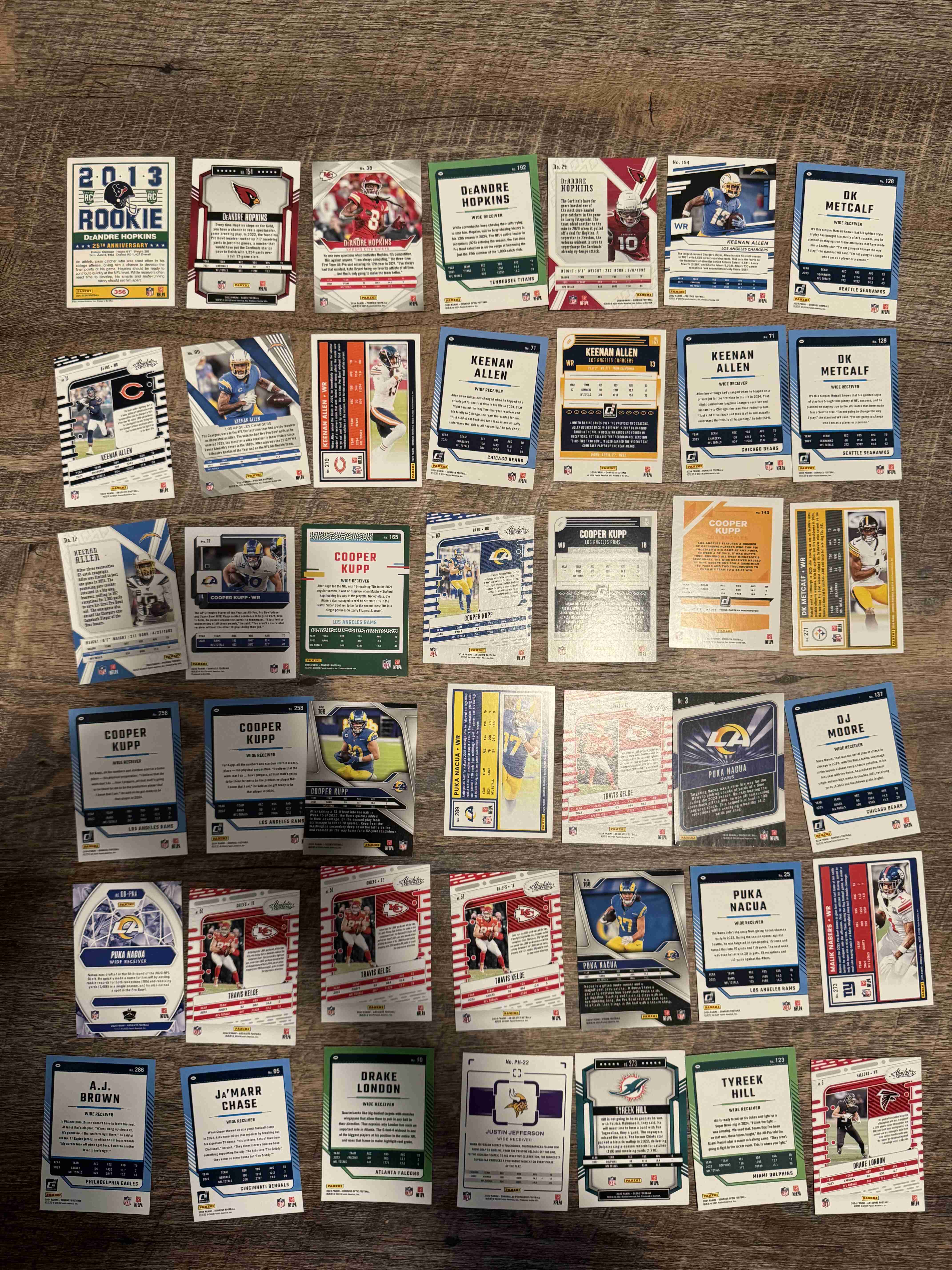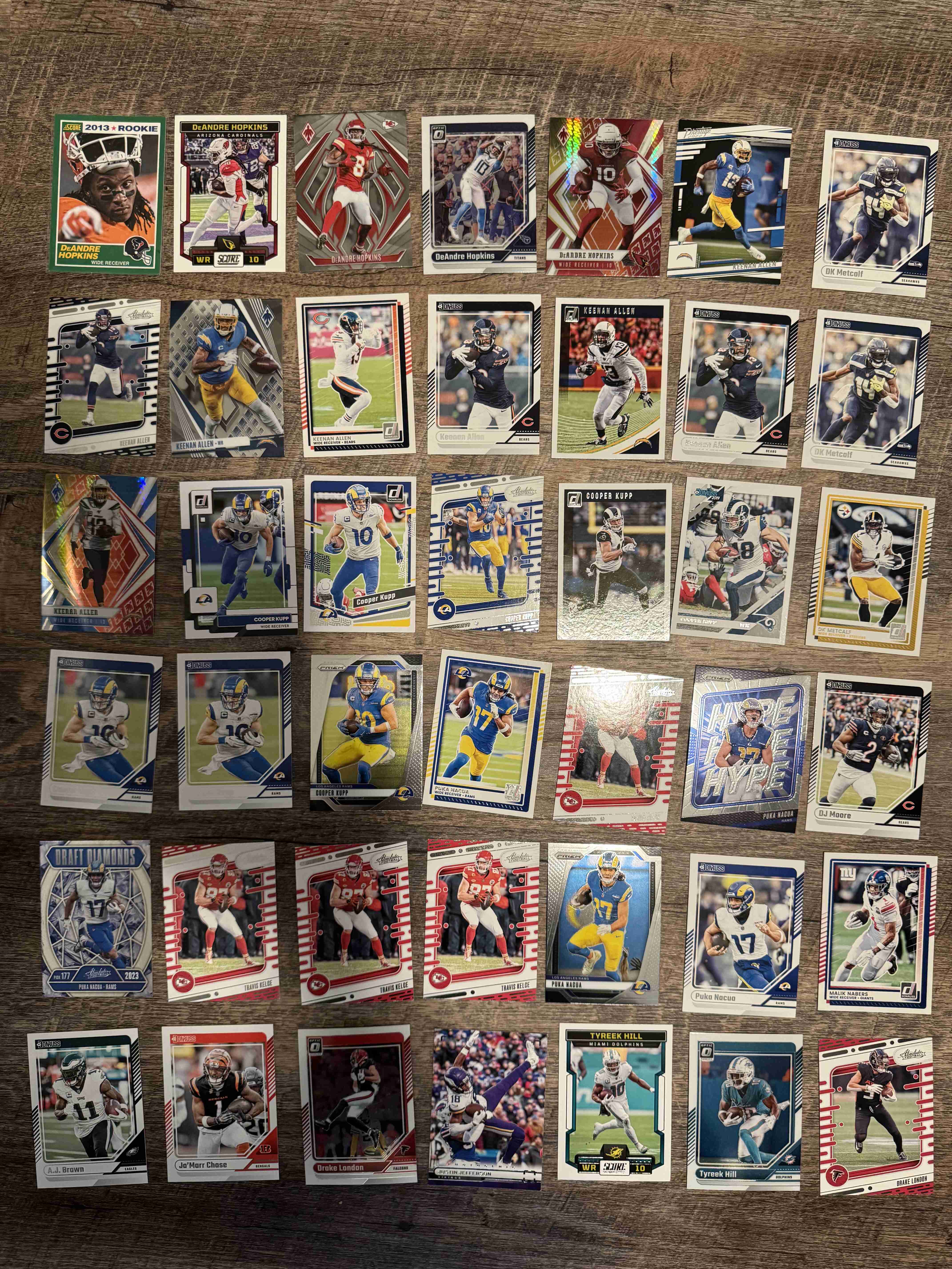 This auction is for a 42-card lot of All-Pro, Pro Bowl, and Star WRs/TE including DeAndre Hopkins, Keenan Allen, Puka Nacua, DK Metcalf, Cooper Kupp, DJ Moore, Travis Kelce, Justin Jefferson, Drake London, Tyreek Hill, and Ja’Marr Chase. Cards include Prizm, Phoenix, Optic, Donruss, and Score as well as a DeAndre Hopkins RC and parallels. Cards ship in a team bag and bubble mailer.