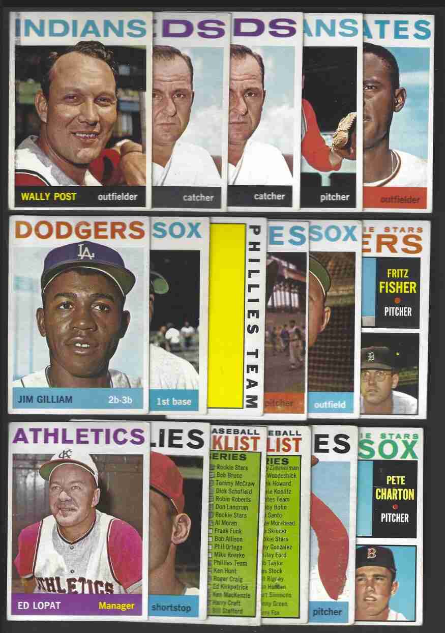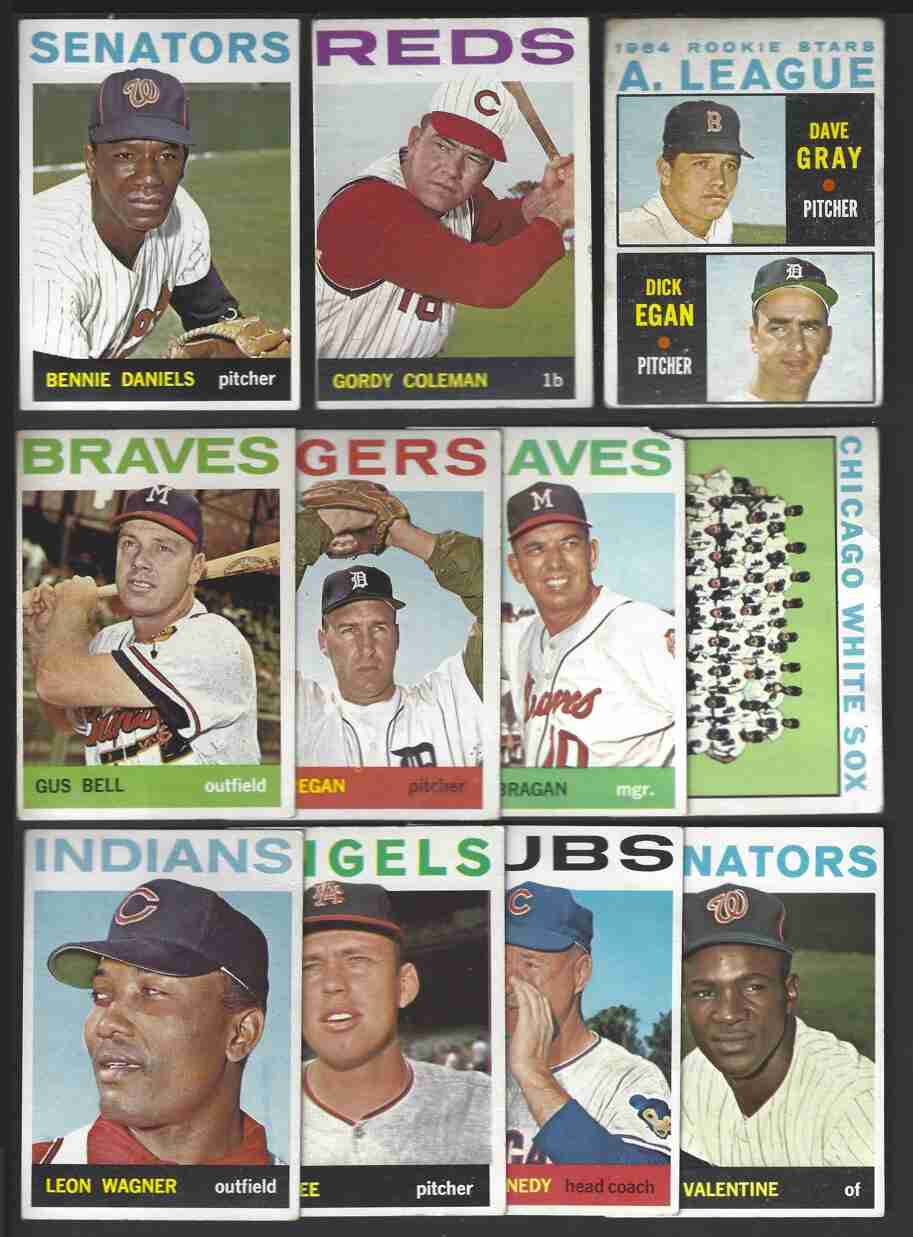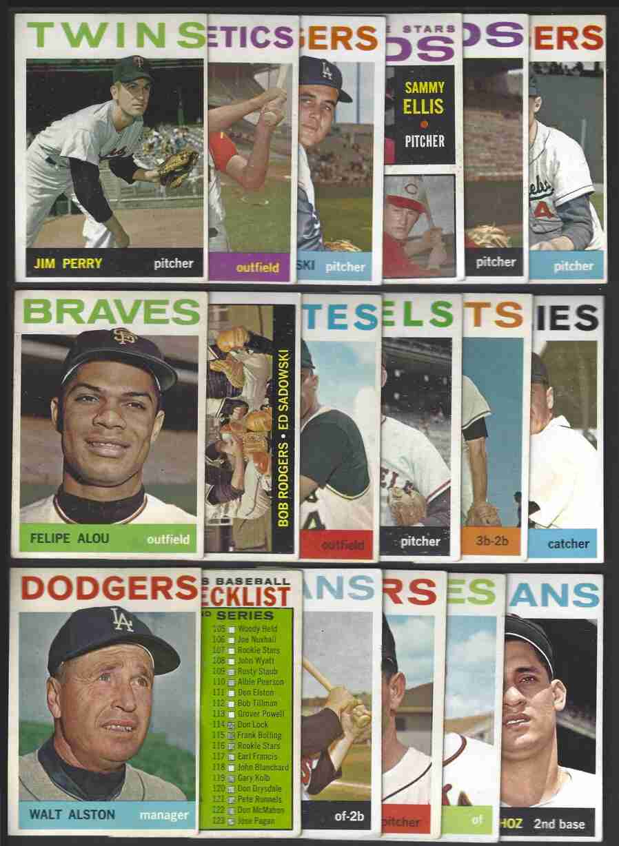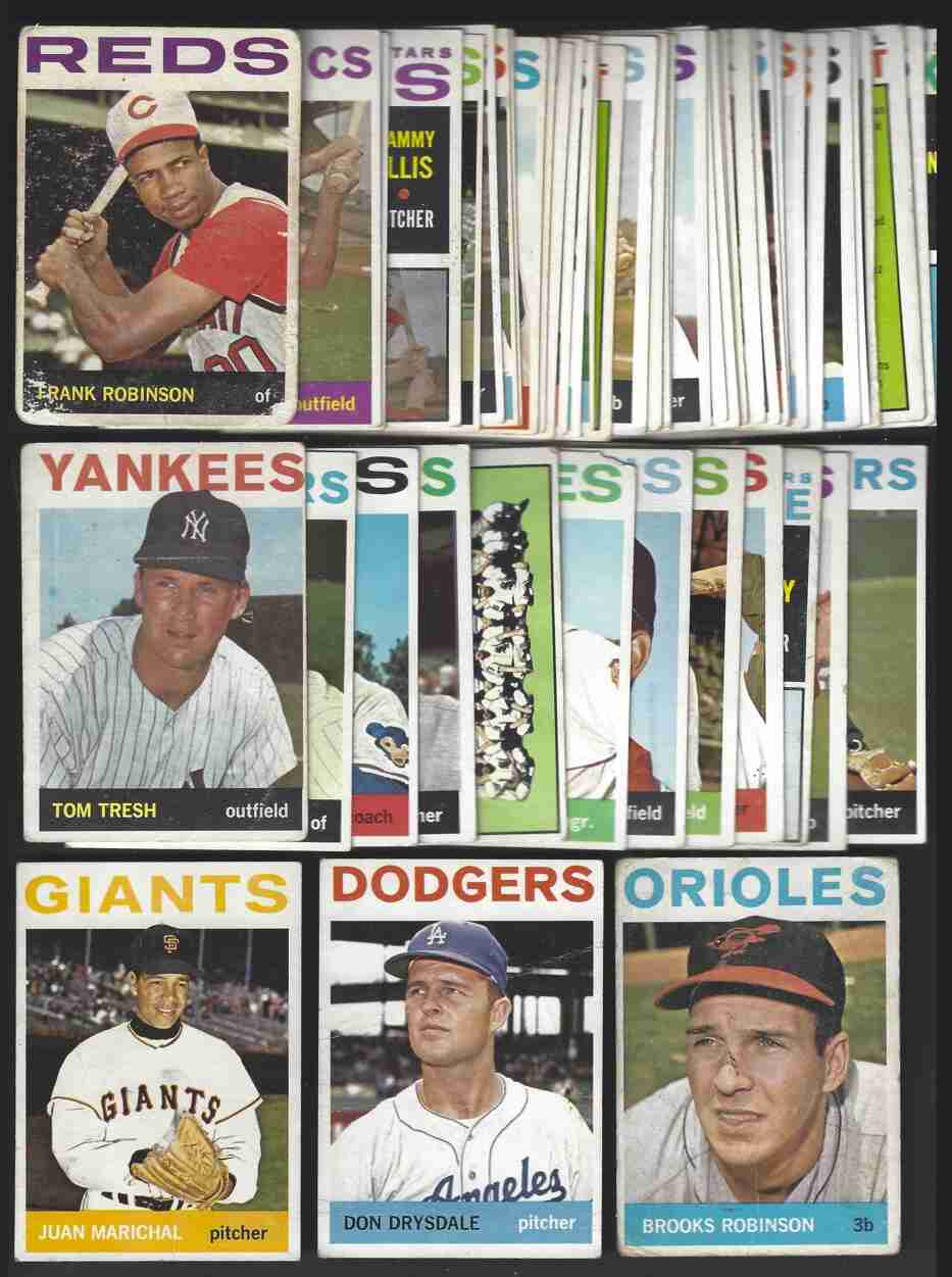 1964 Topps Baseball Lot (50). Low-series (37) No's-26,30,33,34,49,51,61,62, 65,71,82,83,101(HOF),102,105,120(HOF),197,198,216,230(HOF),233(2),234,246, 253,260(HOF),274,280(HOF),283,293,307,308,310,312,347,348,362. Semi-Hi No's No's (8) -395,396,459,483,486,493,496,506. Hi No's (6)-#530,534,535,572,577, 587. Nice lot of 1964 Topps baseball cards. Cards are in the lower-grade range due to corner wear. Some have wrinkle/crease. Cards have bright color. Decent lot if you don't mind cards with some corner wear. Please review scans carefully for condition.