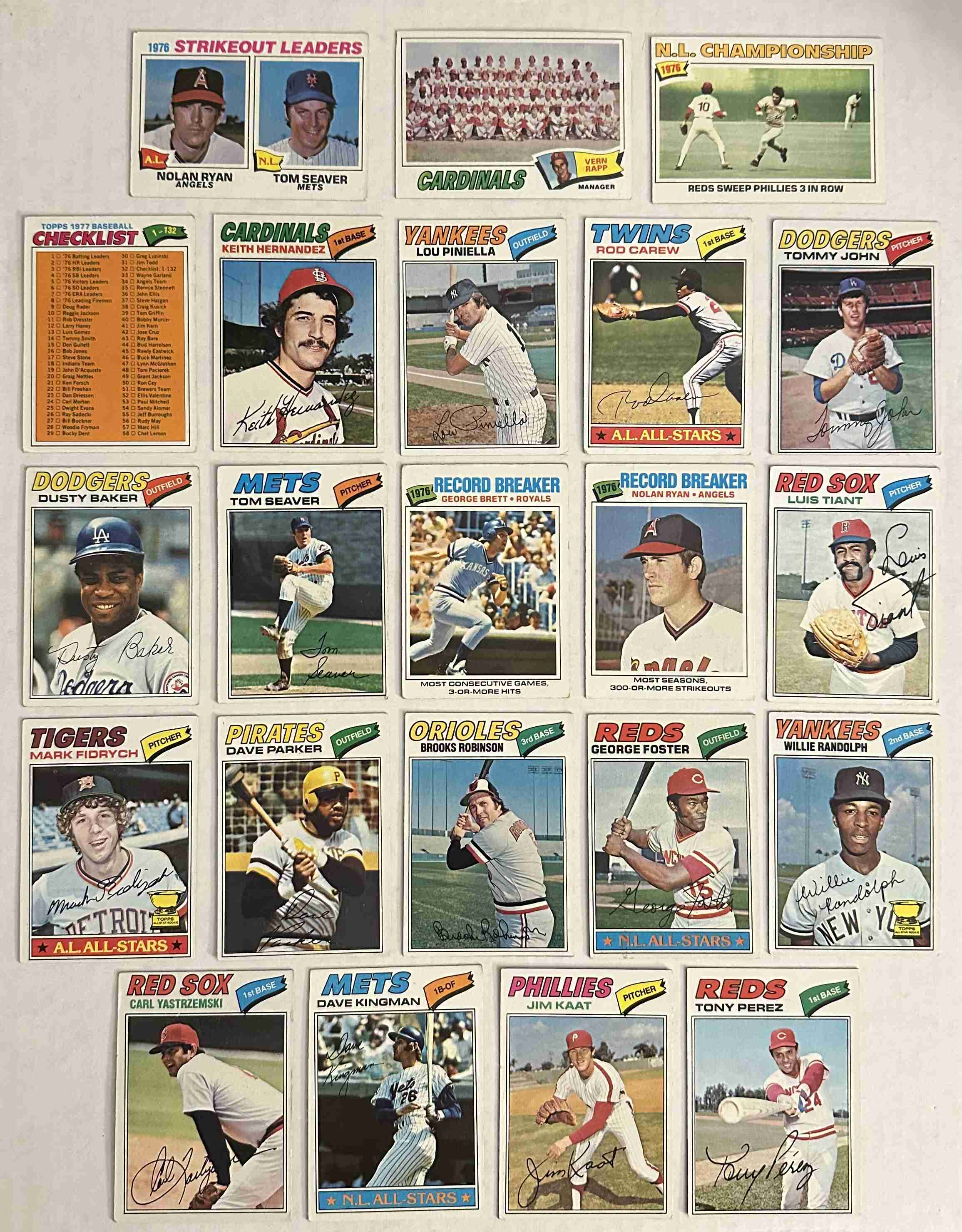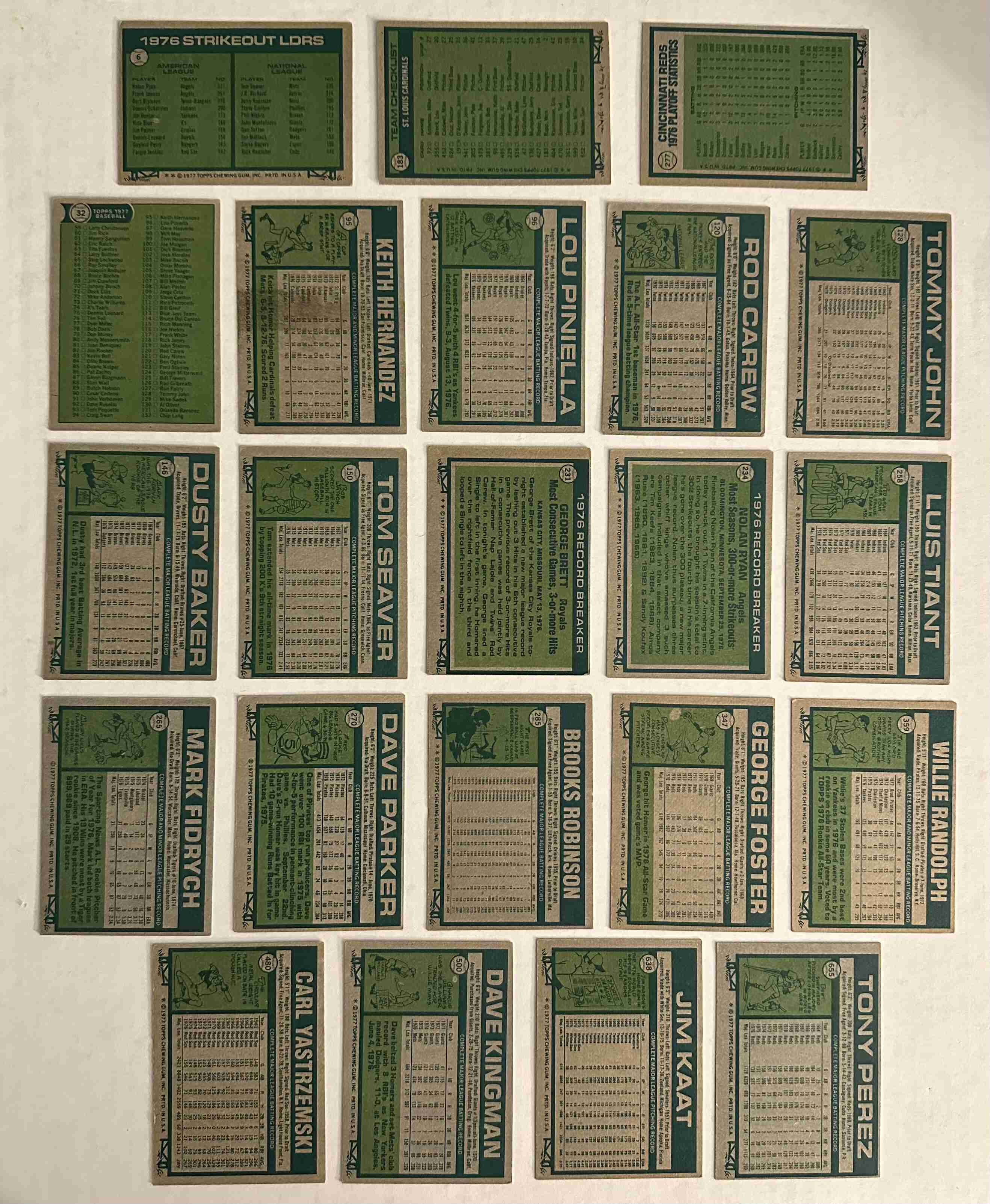 6 Ryan/Seaver, 32 Checklist, 95 Hernandez, 96 Pinella, 120 Carew, 128 John, 146 Baker, 150 Seaver, 183 Cardinals, 231 Brett, 234 Ryan, 258 Tiant, 265 Fidrych, 270 Parker, 277 '76 NL Champ, 285 Robinson, 347 Foster, 359 Randolph, 480 Yastrzemski, 500 Kingman, 638 Kaat, 655 Perez