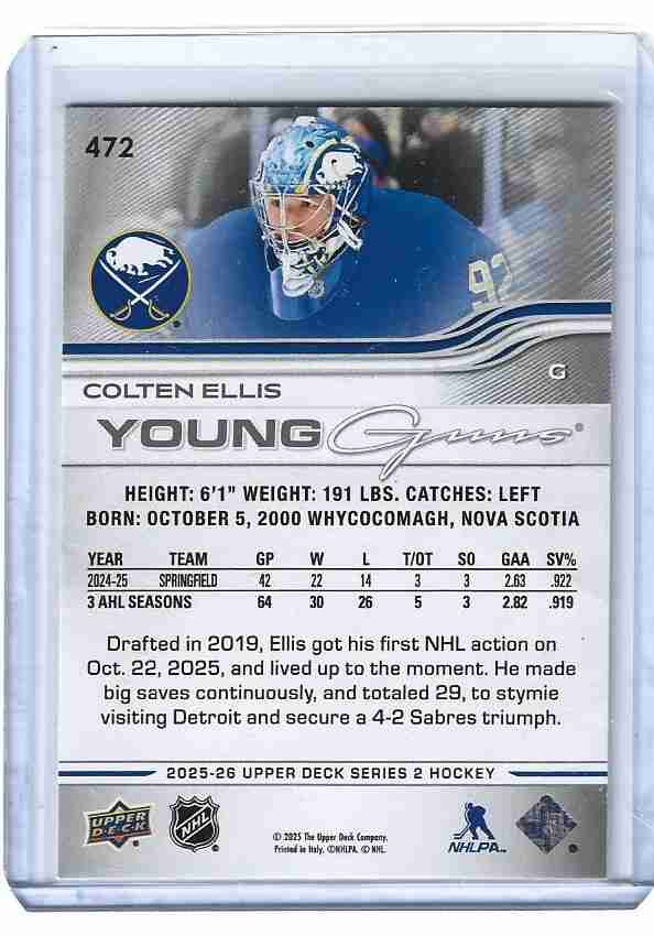 2025/26 UD 2 #472 COLTEN ELLIS YOUNG GUNS
