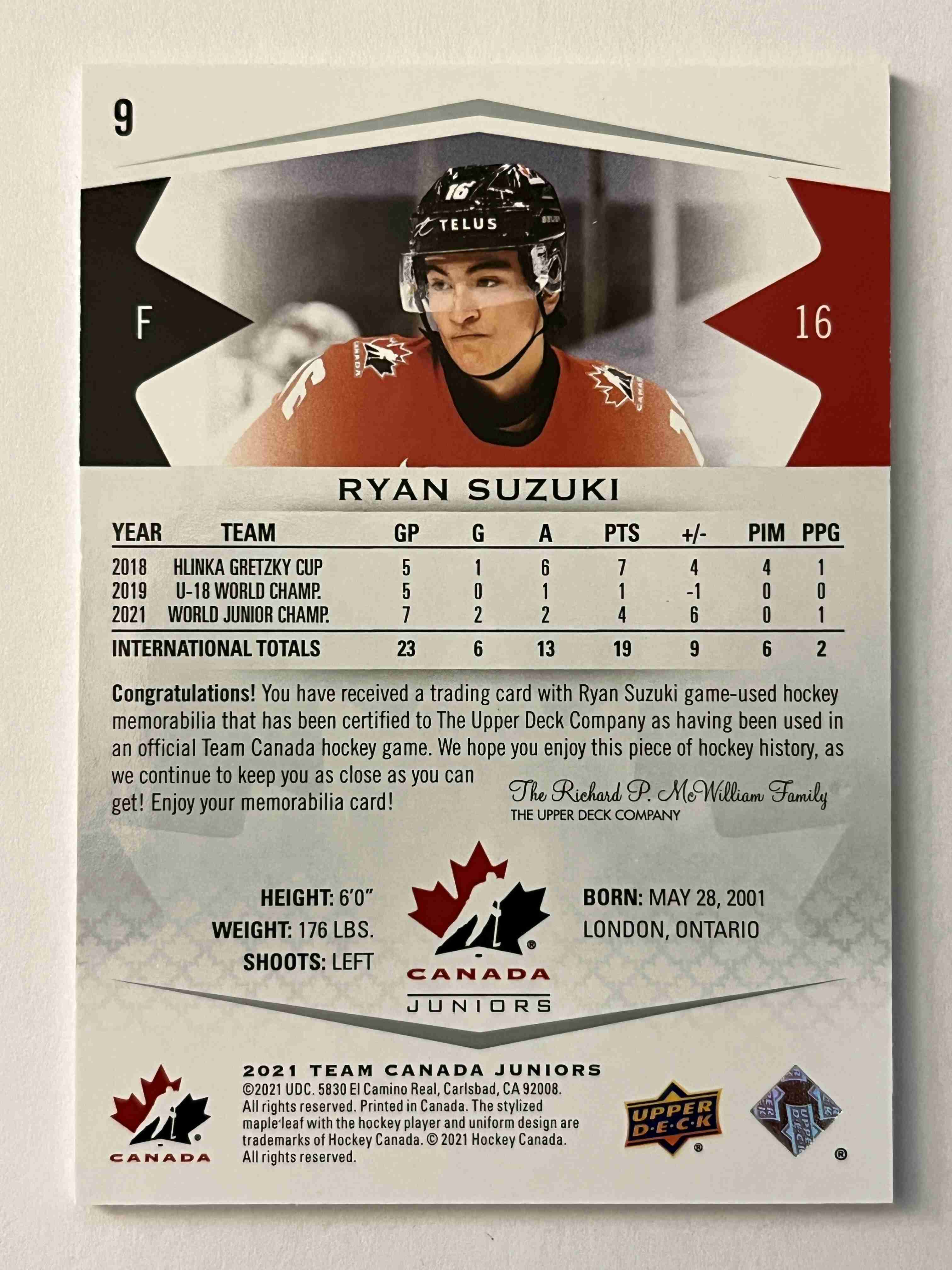 Ryan Suzuki 2021 Upper Deck Team Canada Juniors Jersey