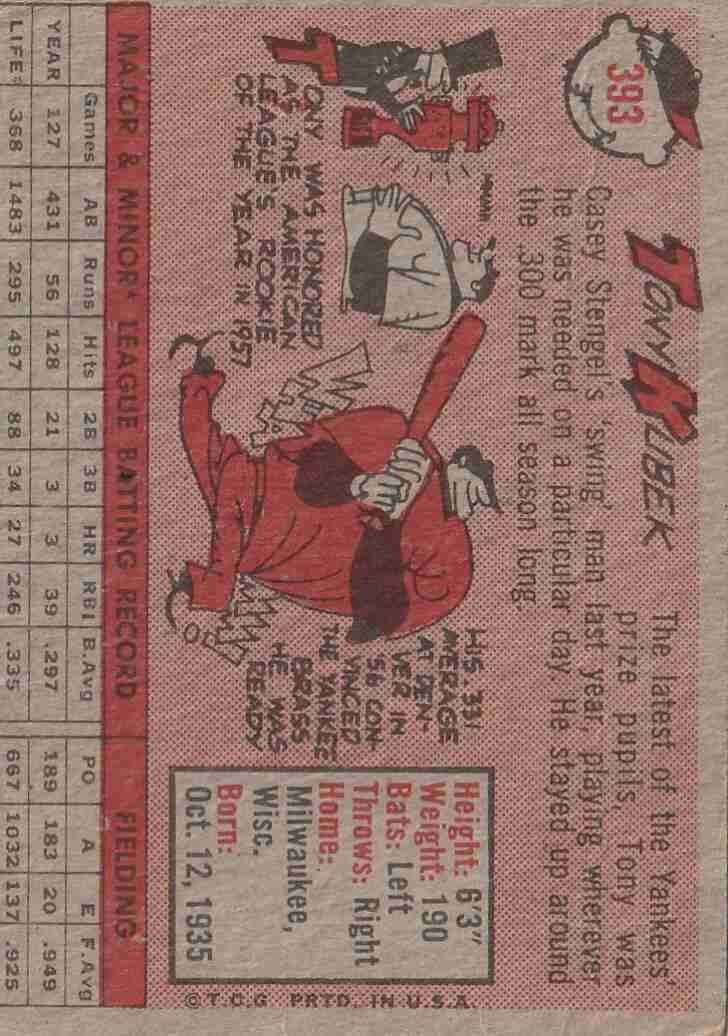 1958 Topps #393 Tony Kubek NY Yankees (lower grade)