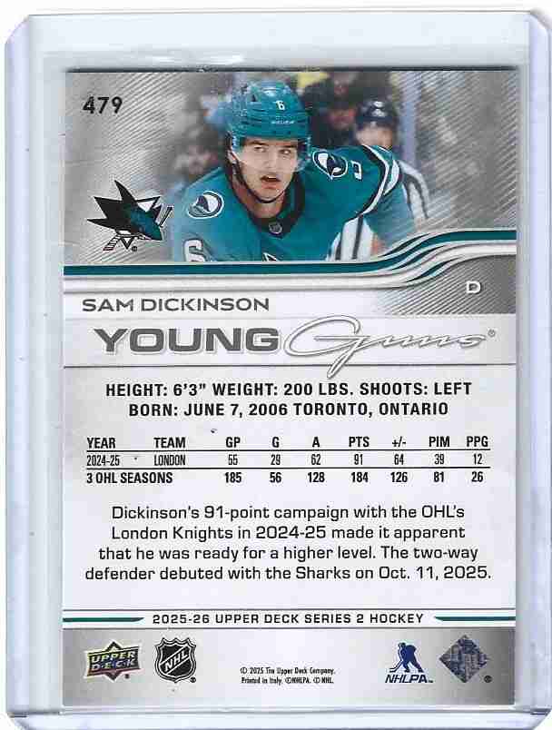 2025/26 UD 2 #479 SAM DICKENSON YOUNG GUNS