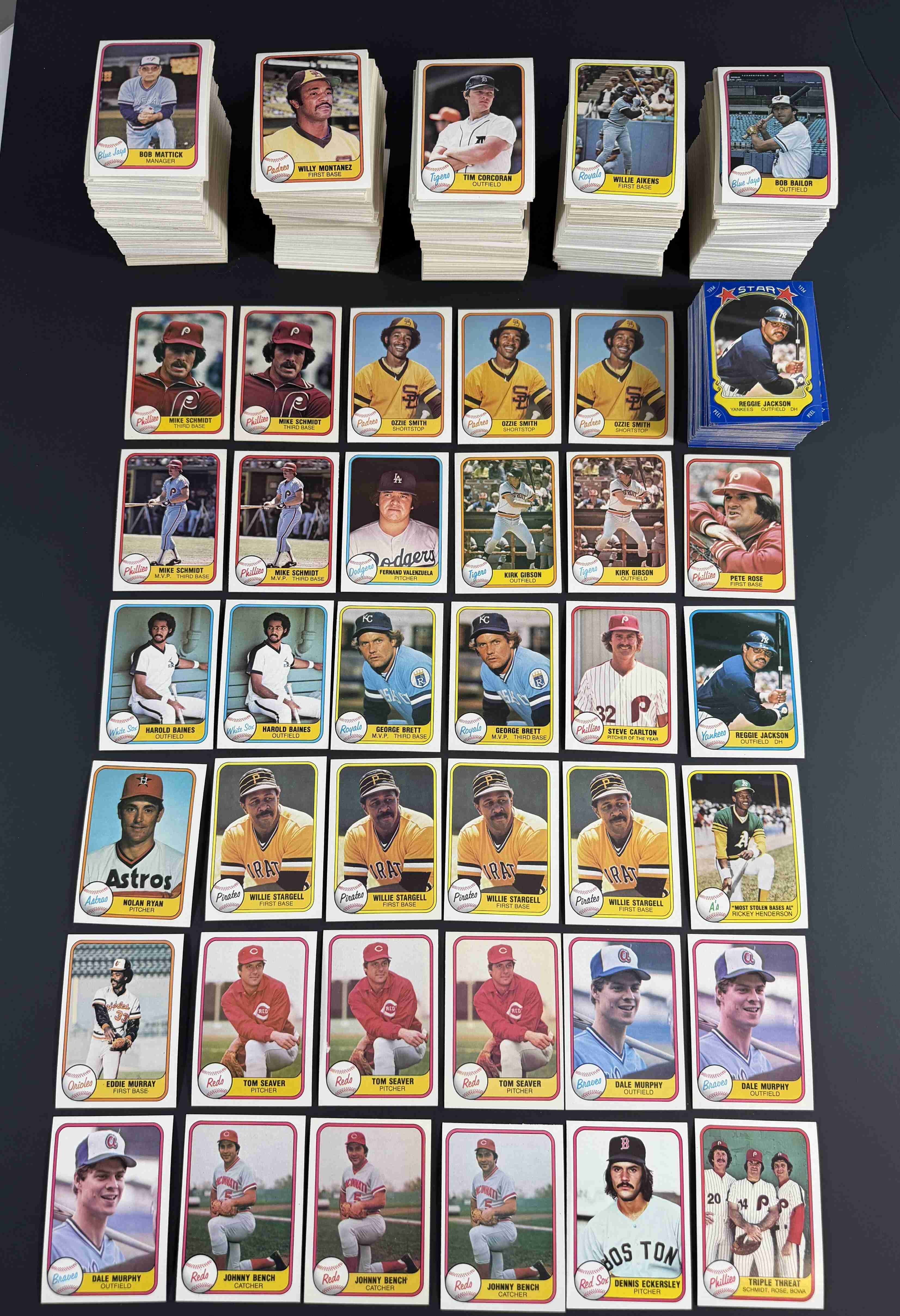 1000 assorted 1981 Fleer plus 69 1981 Fleer Sar Stickers(All different & includes stars). This lot is absolutely loaded with stars & HOFers. Includes a Fernando Valenzuela RC, (2) Harold Baines RC's, (2) Kirk Gibson RC's as well as RC's of Backman, Charboneau and Ainge. Includes 119 HOFers including Nolan Ryan, Reggie Jackson and Multiples of Ozzie Smith, George Brett, Mike Schmidt, Carl Yastrzmski. All the stars are pictured. It's absolutely loaded with value. Overall condition is NM with some better and some a little worst.