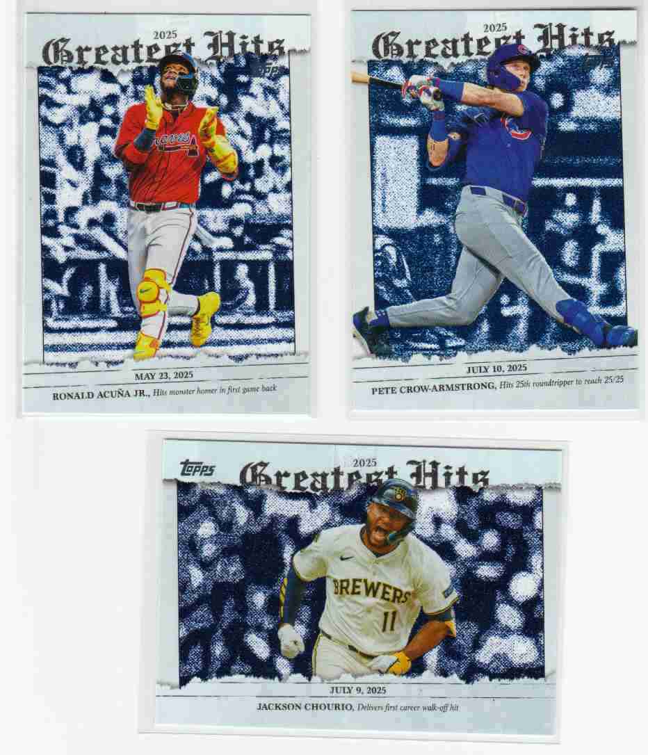 Please take a look at the photos for details on the cards' condition. The cards you are bidding on are the cards pictured. This auction is for 3 2026 Topps Series 1 2025 Greatest Hits inserts. View the photo for a complete listing. You can use your judgment on the grade of the cards. If you have any questions or require more detailed photos, please don't hesitate to ask. Note: The shipping price shown is for PWE. The card will ship with a tracking number if the final auction price exceeds a certain dollar amount (or if it is combined with the appropriate number of other completed auctions). Otherwise, the card will be shipped PWE. Thank you!