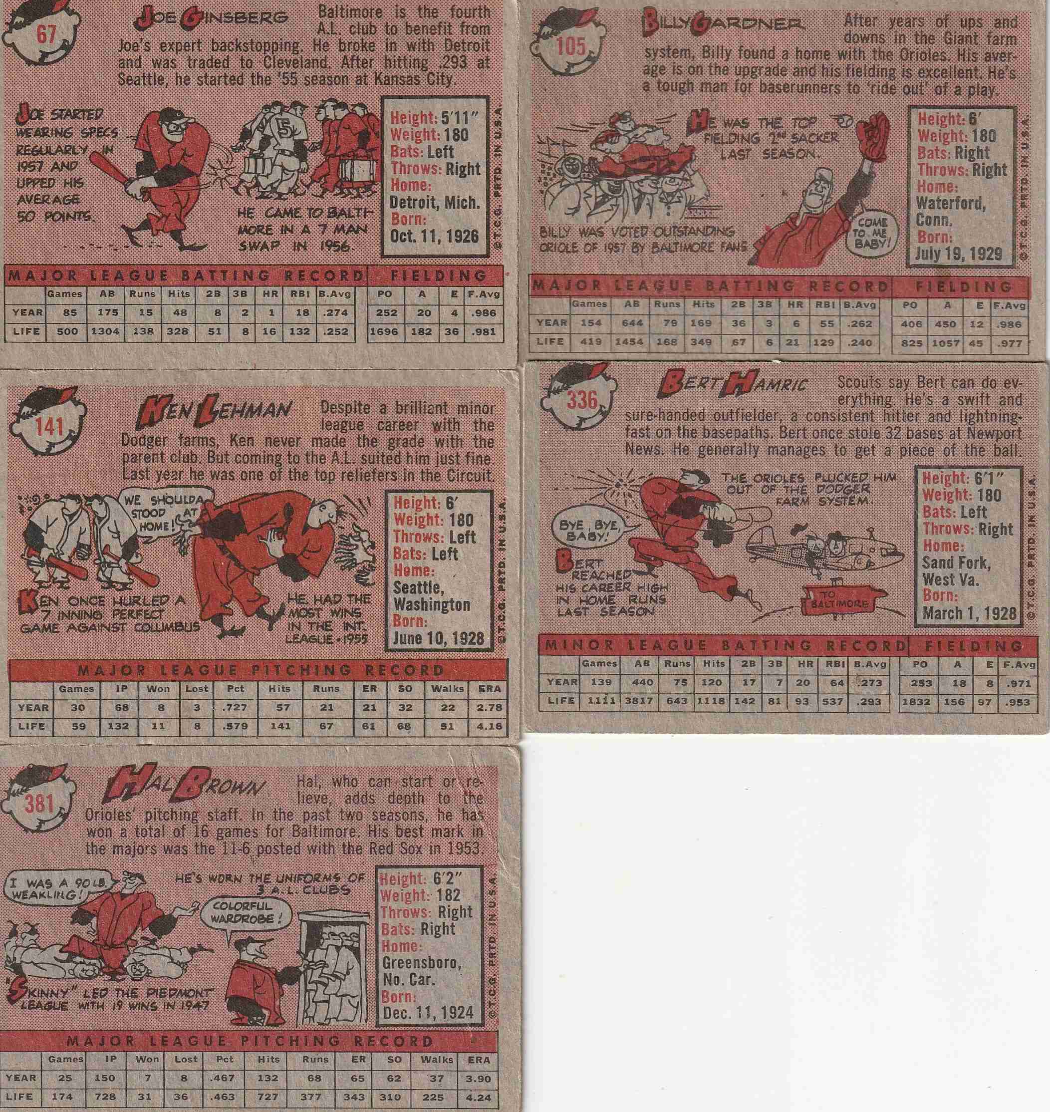 5-1958 Topps Orioles #'s 67 105 141 336 381