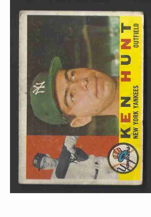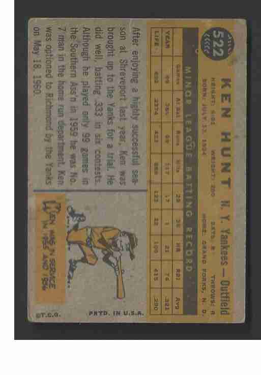 1960 Topps Ken Hunt -#522- Yankees. Scarce Hi-No. Card is in the lower-grade range. Nice card if you are looking to fill some numbers. Ships no tracking. Please review scans carefully for condition.