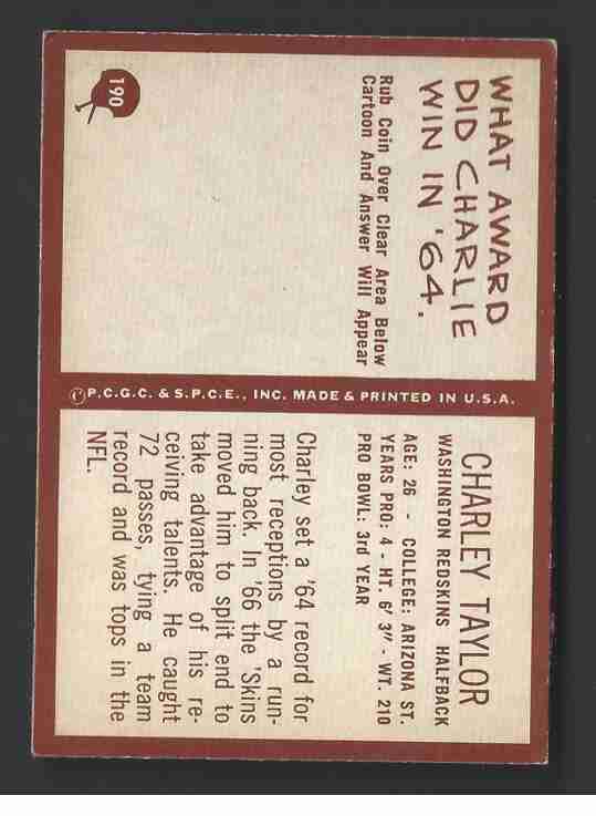1967 Phila Gum Charlie Taylor (HOF) -#190- Redskins. Higher-grade card. Card has minor flaws. Nice shape for this condition-sensitive set. Ships no tracking. Please review scans carefully for condition.