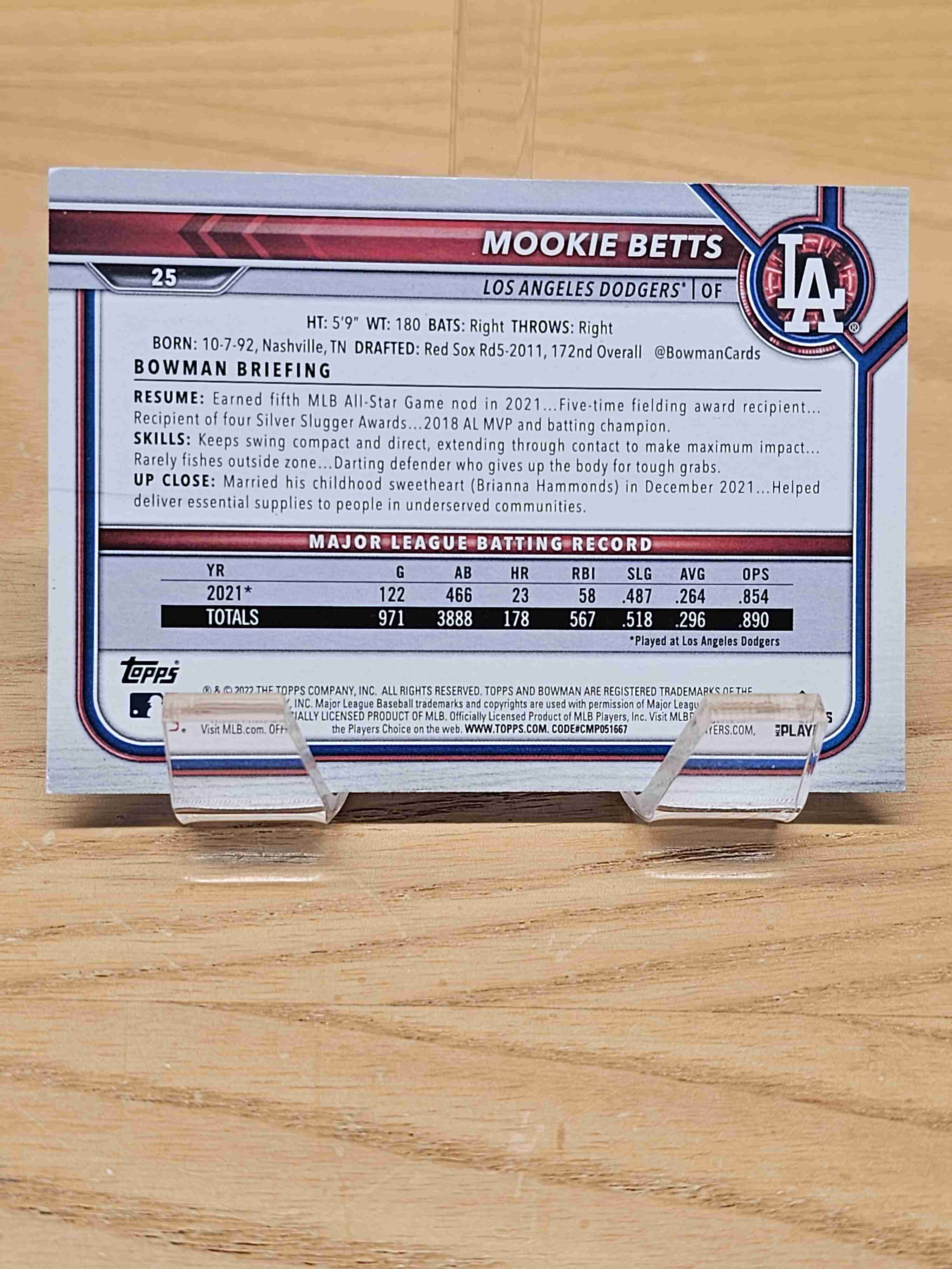 2022 Bowman Baseball Sky Blue /499 Mookie Betts Los Angeles Dodgers Card #25
