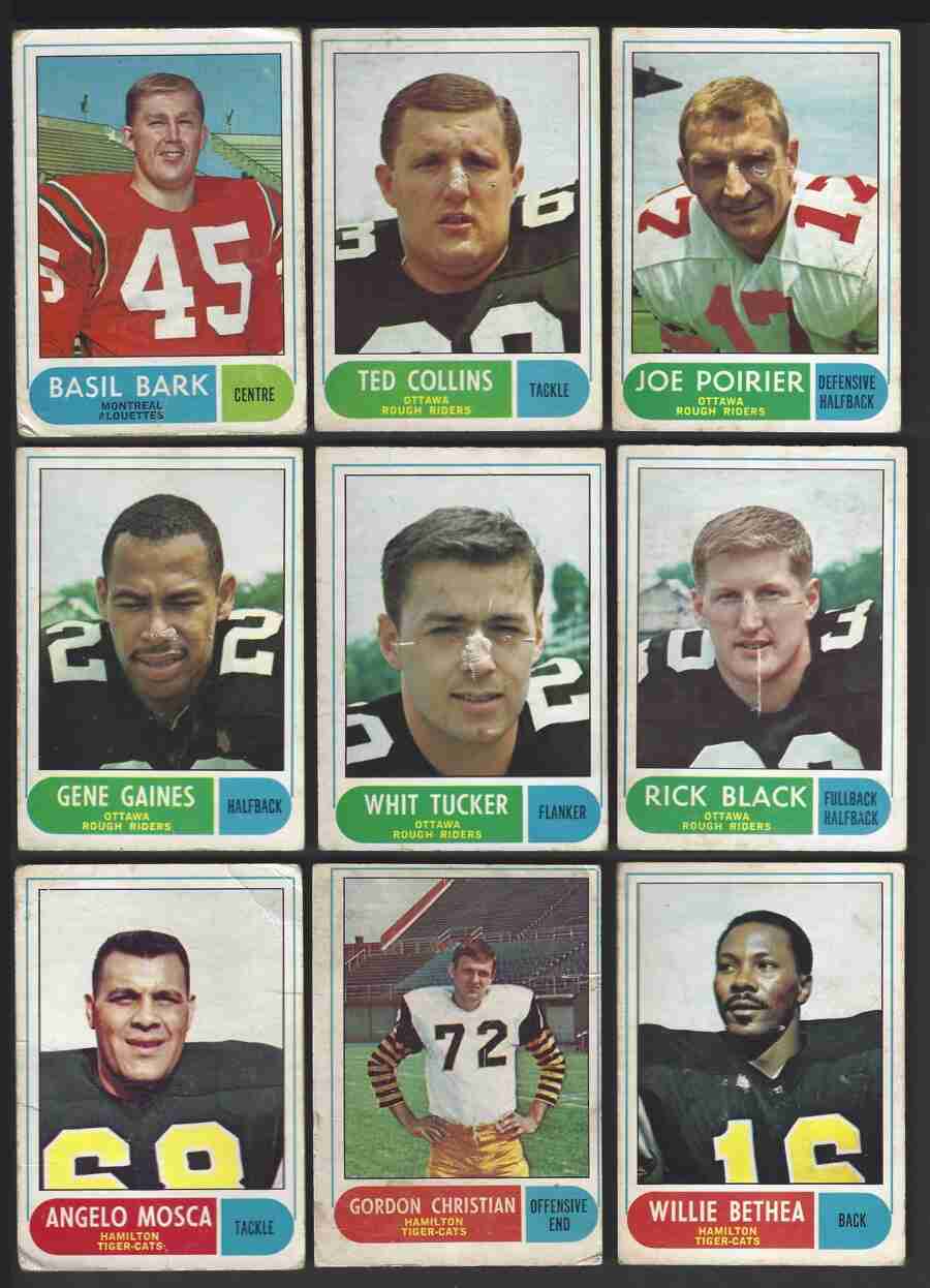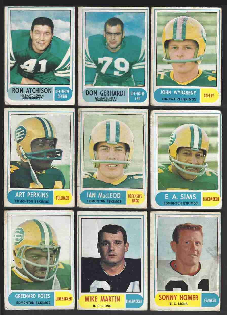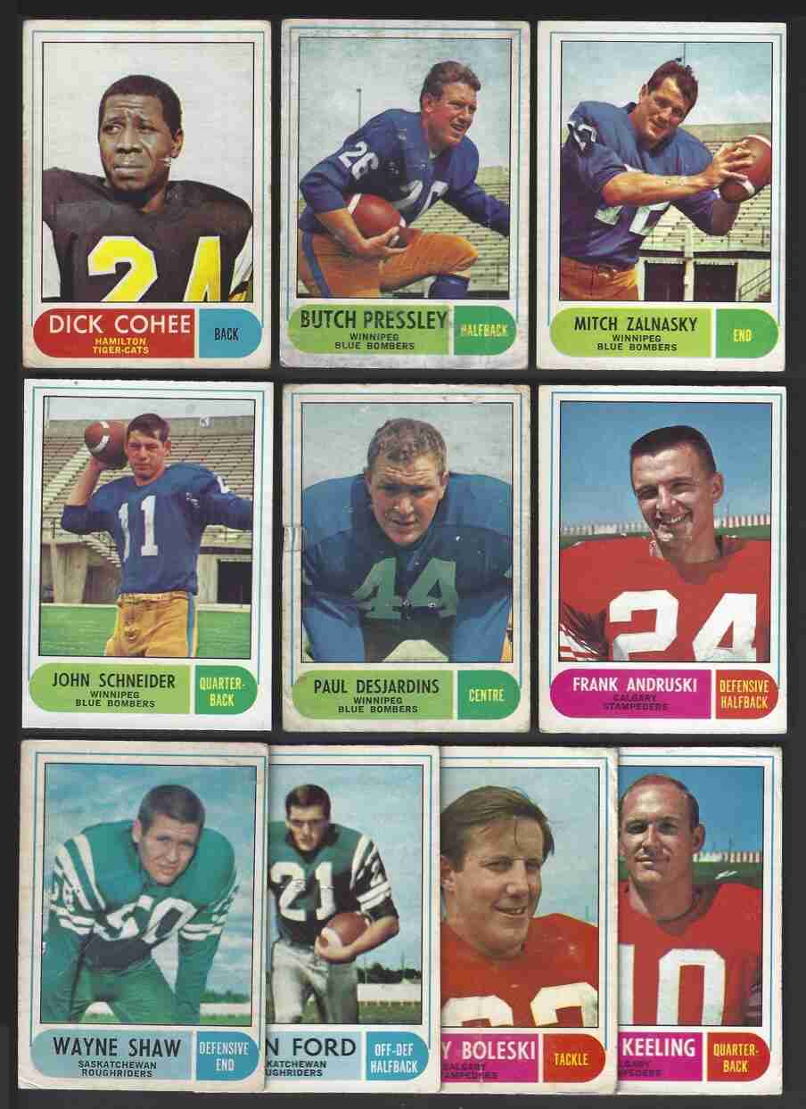 1968 O-Pee-Chee Football Lot (28). No's-8,14,19,21,23,24,43,46,52,53,59,67, 68,70,76,77,81,88,90,94,99,104,106,111,116,117,126,129. Rare large lot of 1968 OPC football cards. Cards are in the lower-grade range - corner wear, wrinkle, crease, ink, paper loss. Decent lot of hard-to-find cards if you don't mind off condition cards. Please review scans carefully for condition.