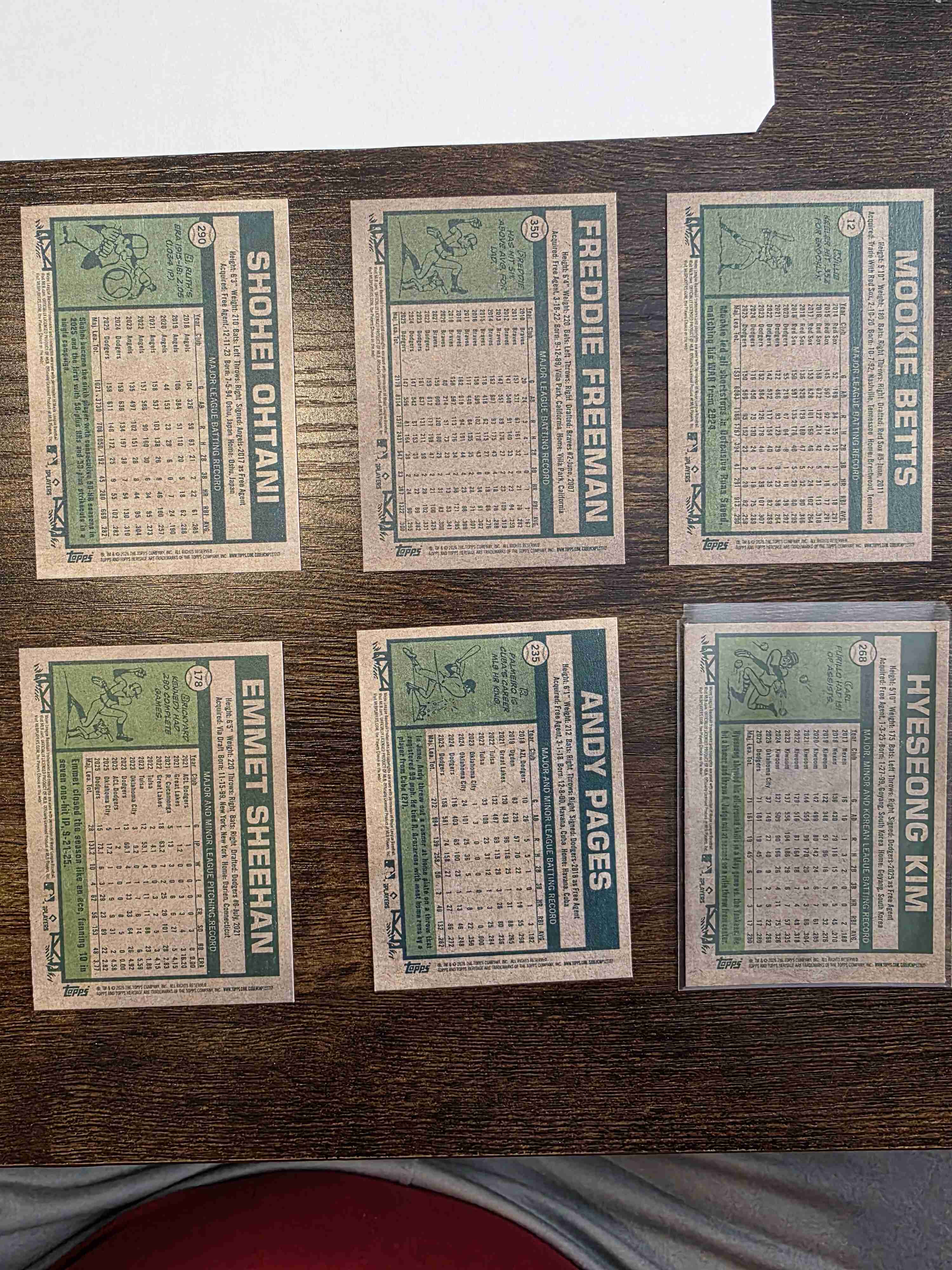 This is a 6 card lot of Los Angeles Dodgers from 2026 Topps Heritage. This lot includes card #12- Mookie Betts, card #178- Emmet Sheehan, card #235- Andy Pages, card #290- Shohei Ohatni, card #350- Freddie Freeman, and card #268 Hyeseong Kim (chrome refractor). All cards are, in my opinion, near mint - mint.