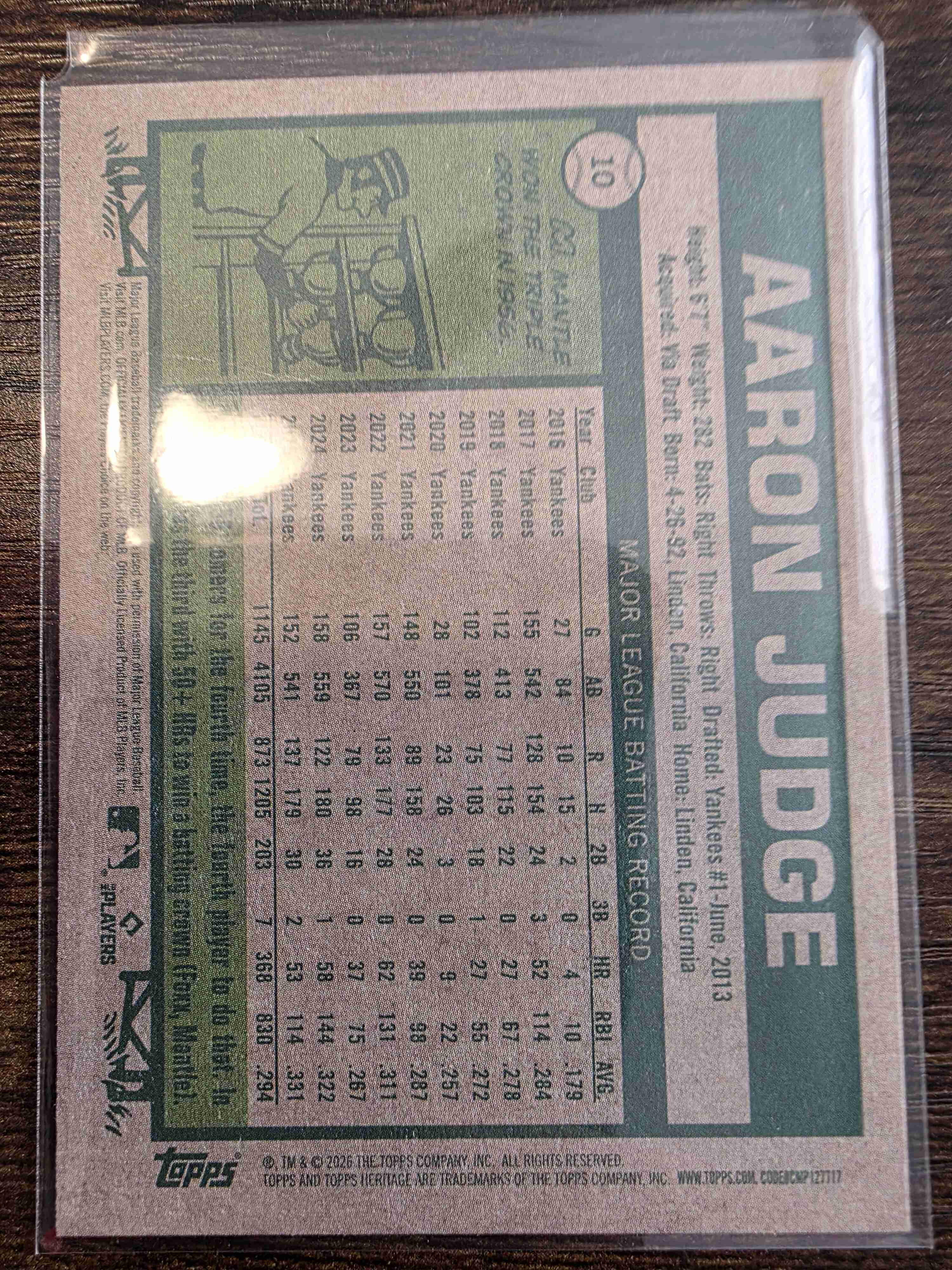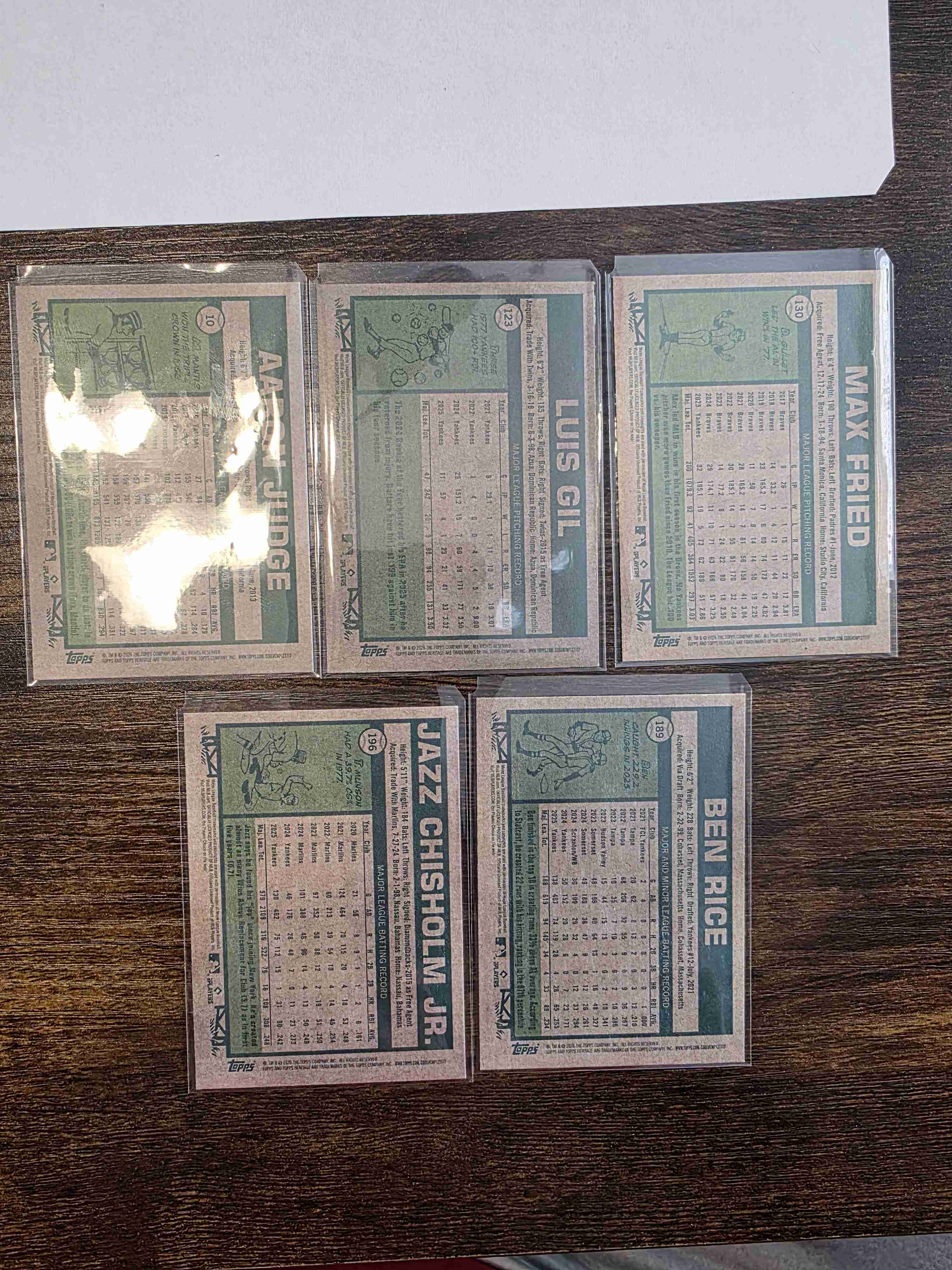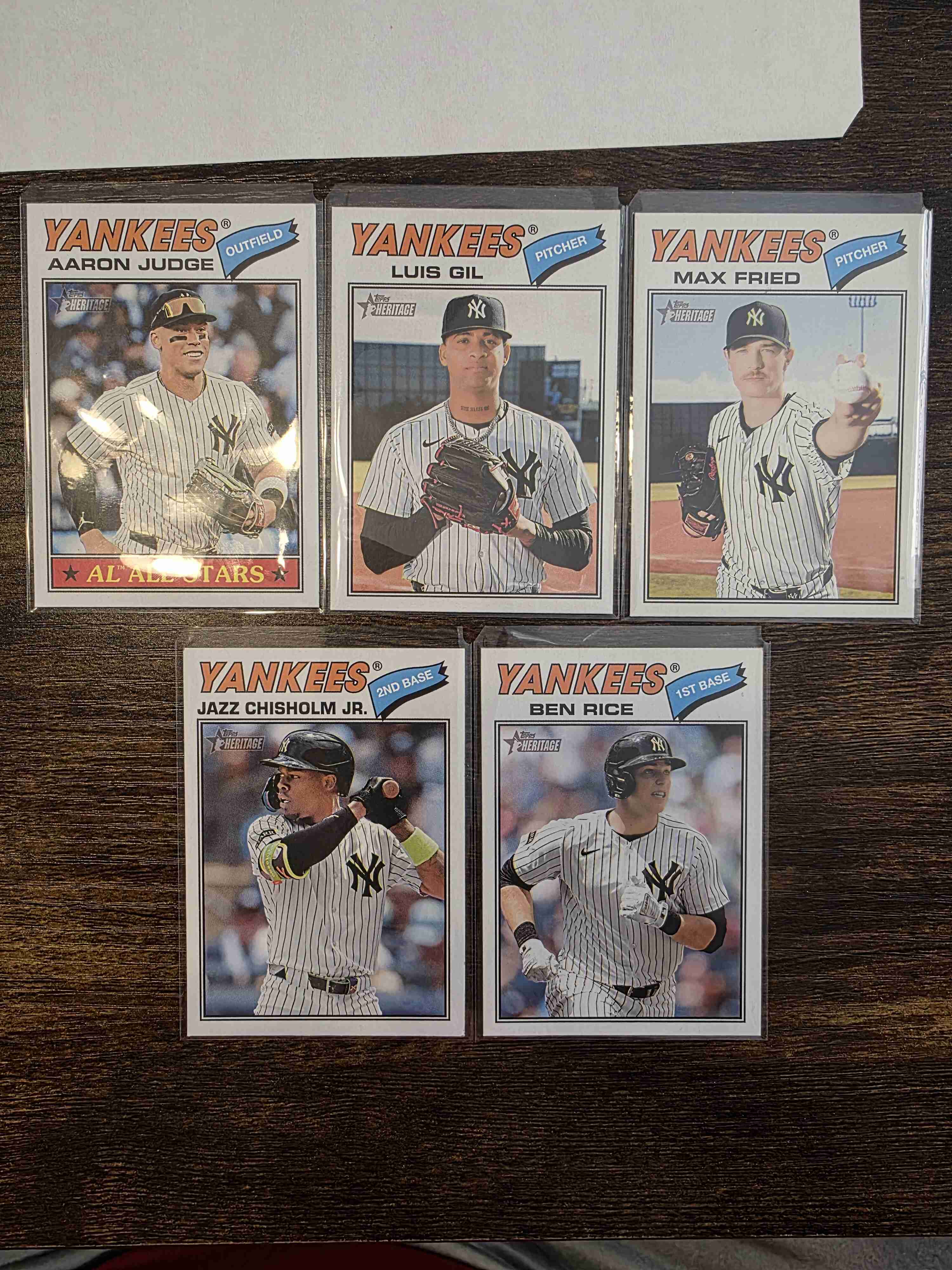 This is a 5 card New York Yankees lot from 2026 Topps Heritage. This lot includes card #10- Aaron Judge, card #123- Luis Gil, card #130- Max Fried, card #196- Jazz Chisholm Jr., and card #189- Ben Rice. All cards are, in my opinion, in near mint to mint condition.