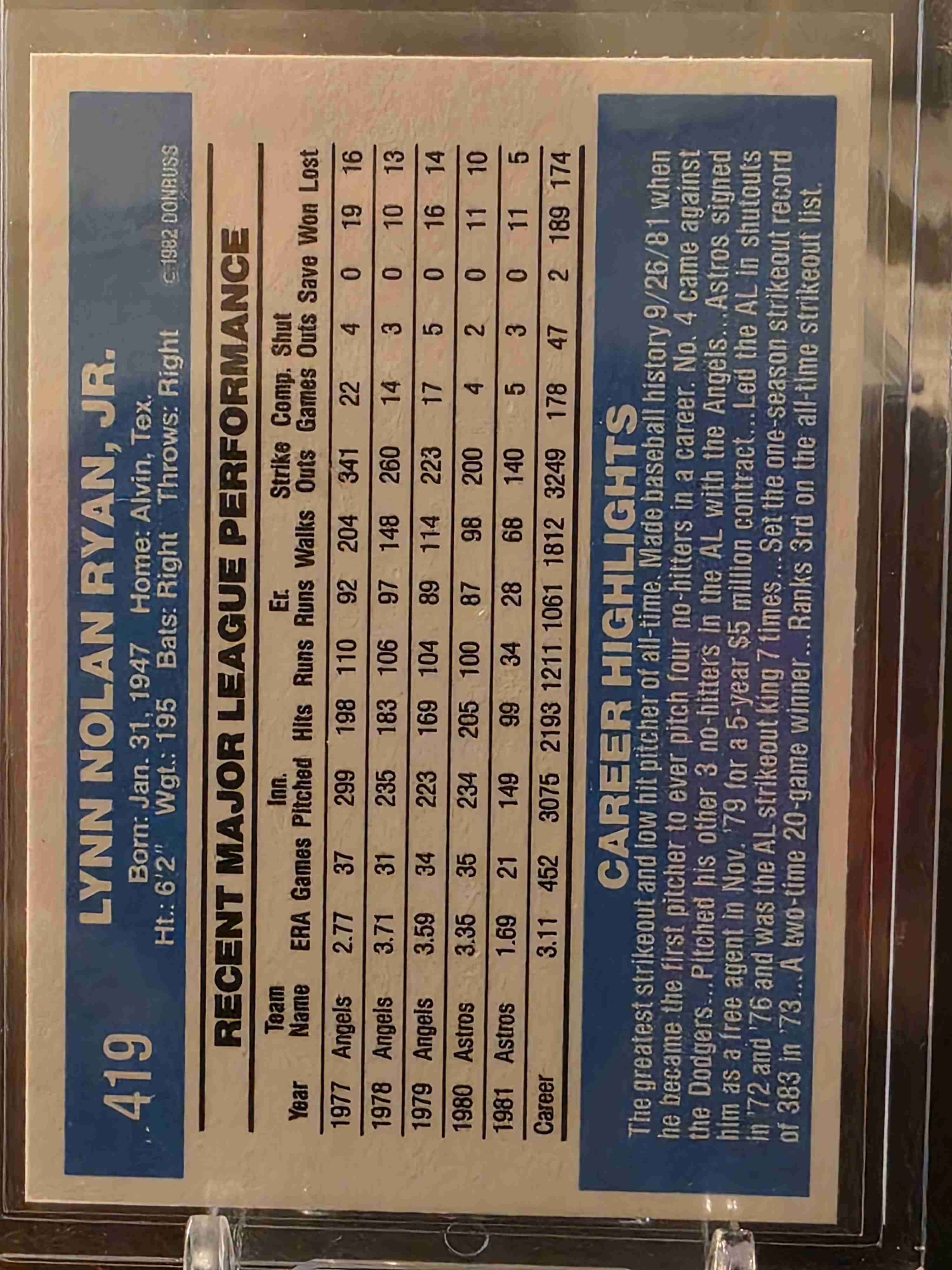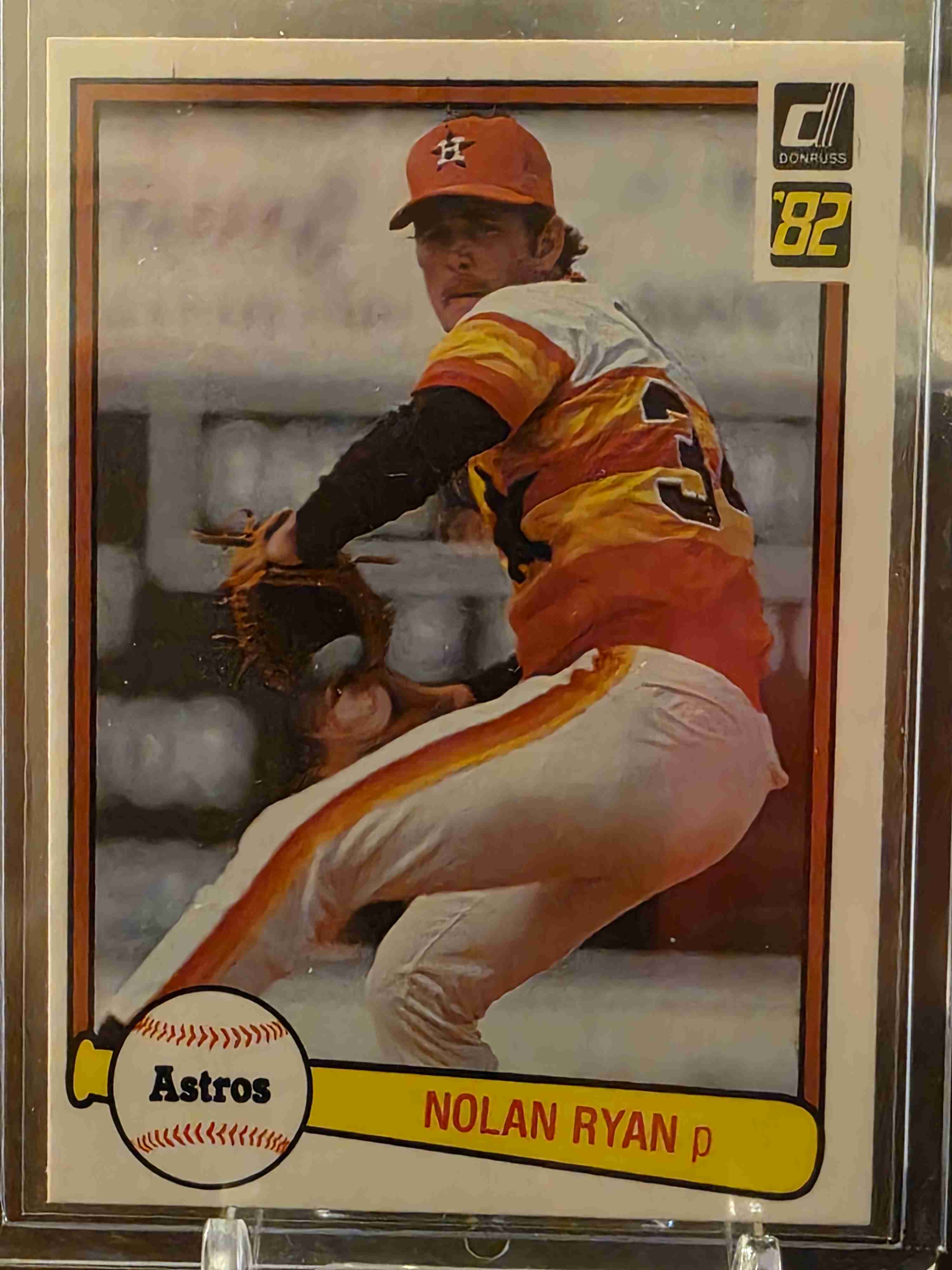 The product is a vintage 1982 Nolan Ryan #419 baseball card from the Major League Baseball (MLB) by manufacturer Donruss. This original sports trading card features the Houston Astros player in near mint or better condition on standard-sized card stock. As part of the 1982 Donruss set, this English-language card is a valuable collectible for fans of baseball and sports trading cards.
