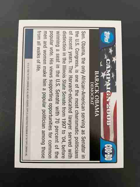 For sale is the 2008 Topps Baseball “Campaign” insert card C08-BO featuring Barack Obama. Part of Topps’ official 2008 Campaign series, this card is a rare collectible that combines baseball and political history. The card is carefully preserved, sleeved, and handled with care, perfect for collectors looking to complete the Campaign insert set or add a standout political-themed insert to their collection. Ships securely with protective packaging.