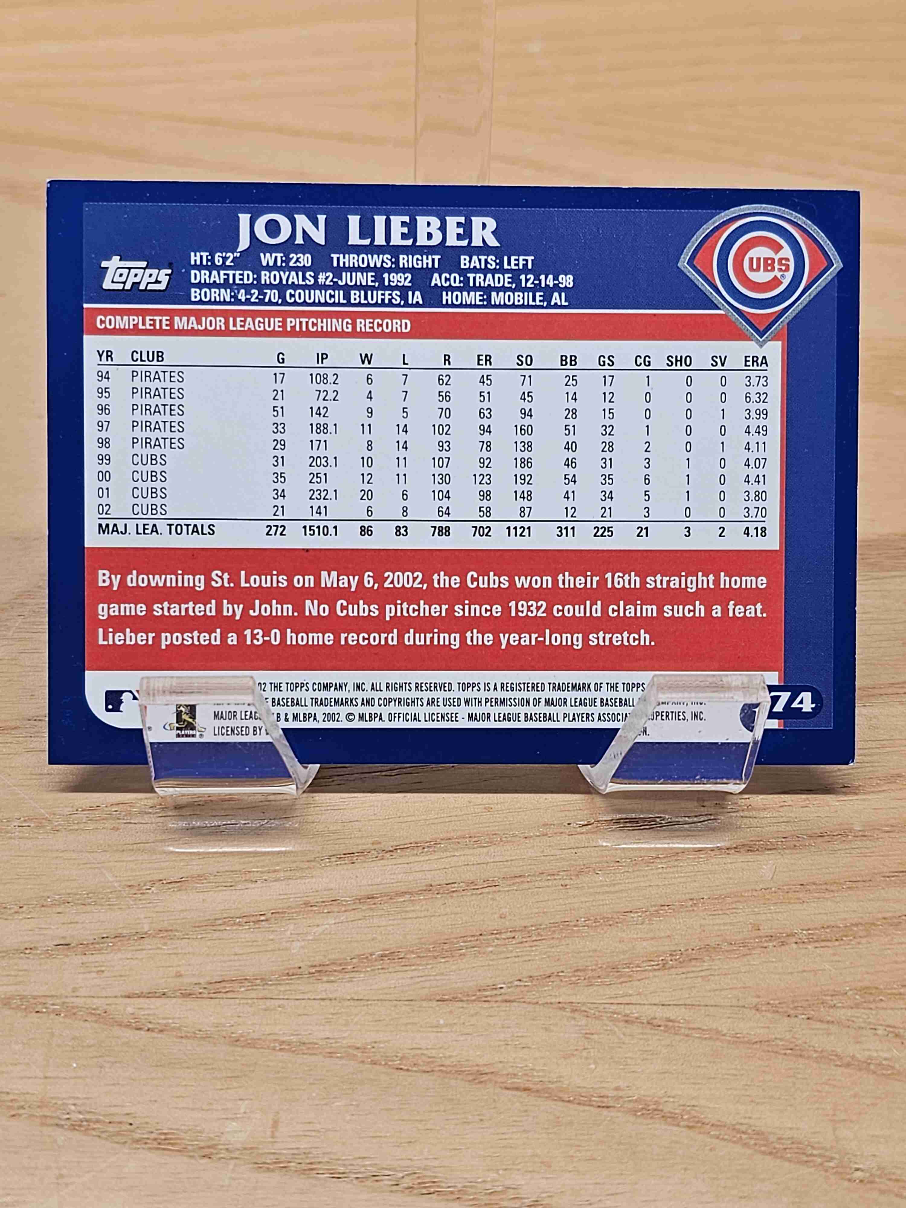 2002 Topps Baseball Jon Lieber Chicago Cubs Card #174