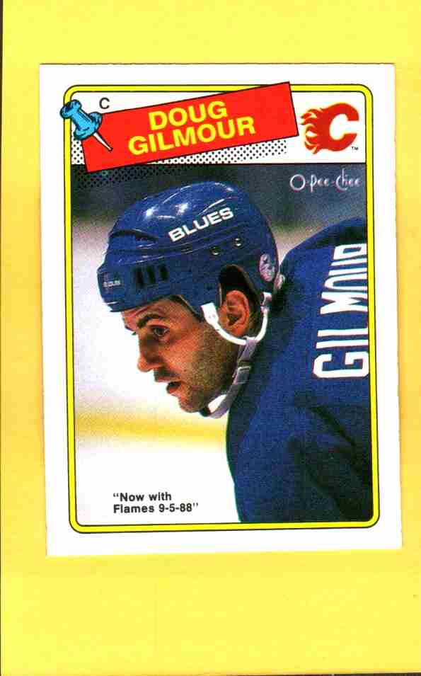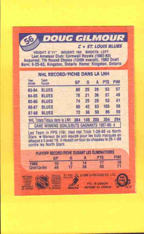 1988 O-Pee-Chee #56 Doug Gilmour card featuring the St. Louis Blues. Early-career card of the Hall of Fame center, showcasing the classic OPC design with bilingual back. Great collectible for hockey fans and vintage card collectors.