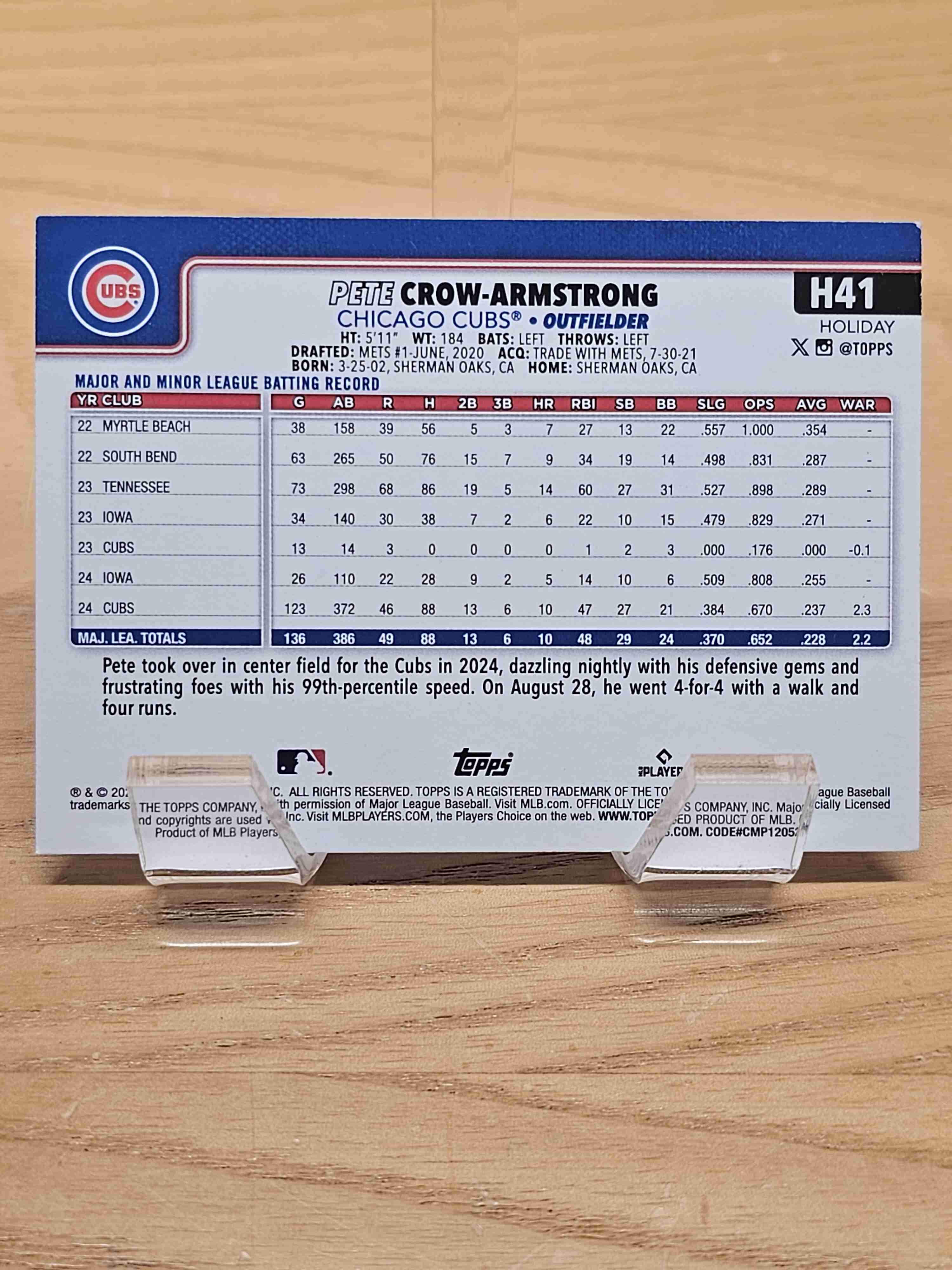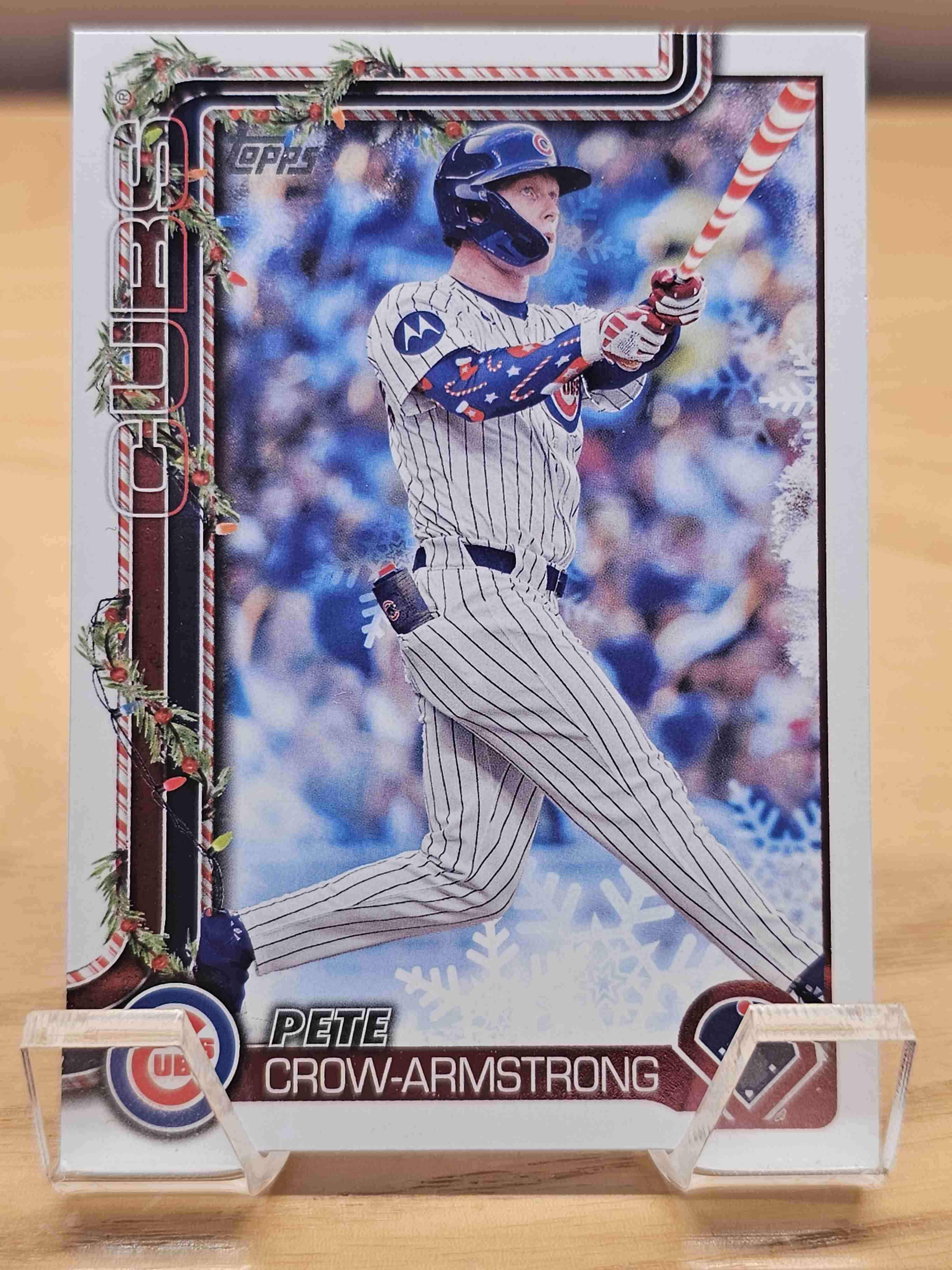 2025 Topps Holiday Baseball Pete Crow-Armstrong With Candy Cane Bat And Candy Canes On Sleeve Chicago Cubs Card #H41