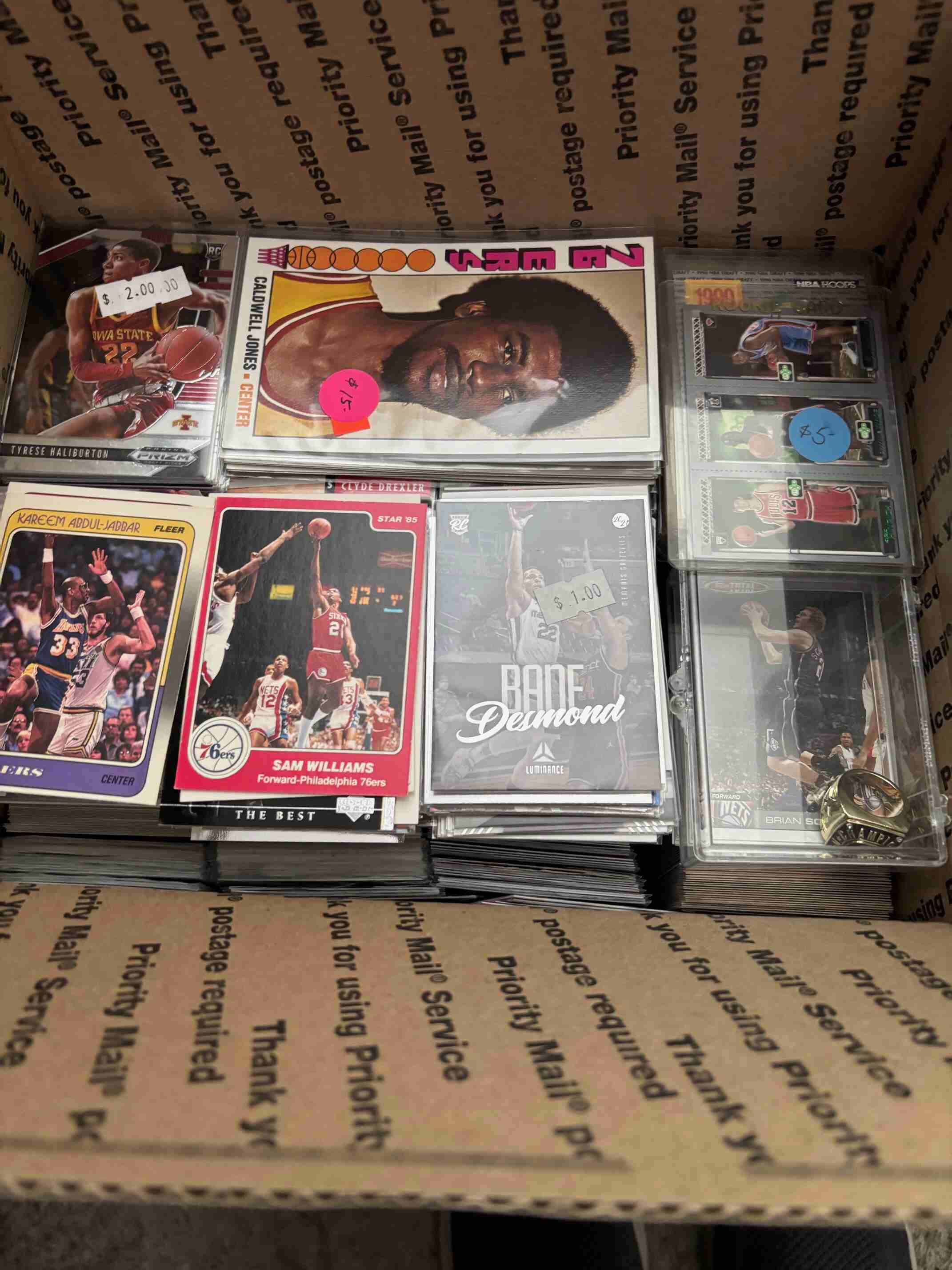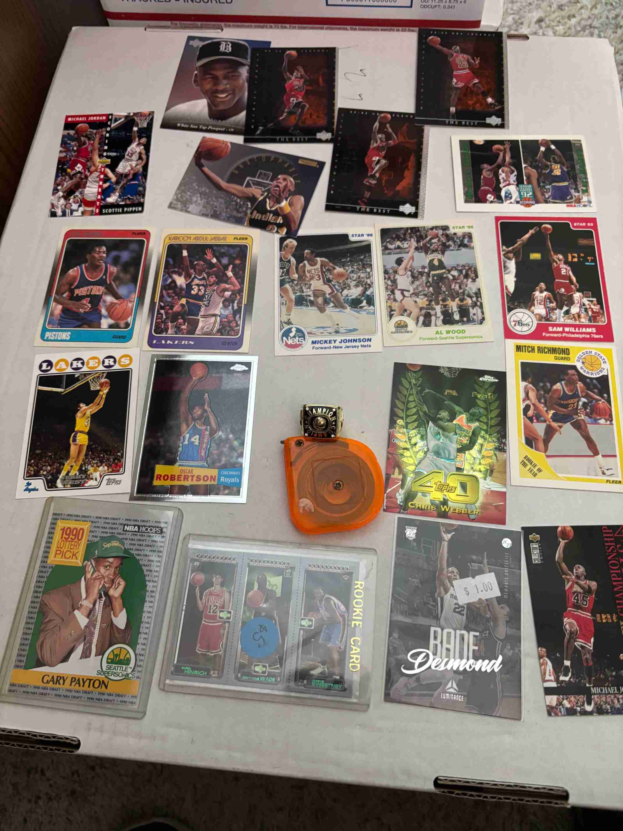 Huge clearance collection of 2500 Basketball cards loaded with high value Vintage, Rookies, Stars, and including an unusual and unknown championship ring. You will receive everything shown in the photos and more. I am having a complete clearance of my 2,000,000 card collection so please check out my other auctions for more great deals.